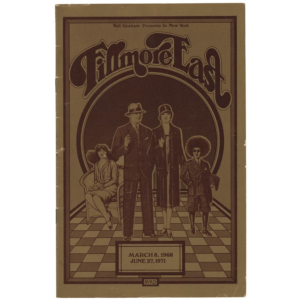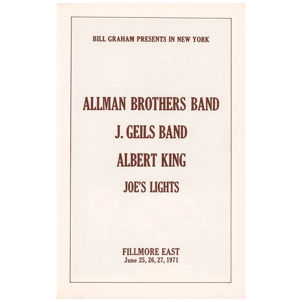 Highly sought-after Fillmore East concert program, 5.5 x 8.5, 36 pages, for the legendary venue's farewell shows on June 25–27, 1971, featuring the Allman Brothers Band, J. Geils Band, and Albert King. The program is filled with ads (most of them relating to the Fillmore's closing) as well as photos of the staff, and photos and biographies of the artists. In fine condition, with light handling wear. These historic shows also had special appearances by Mountain, Edgar Winter's White Trash, Country Joe McDonald, and the Beach Boys, and they fittingly went till daylight. The Fillmore East was only open from 1968 to 1971, and Bill Graham would admit years afterward that he regretted closing this New York gem.