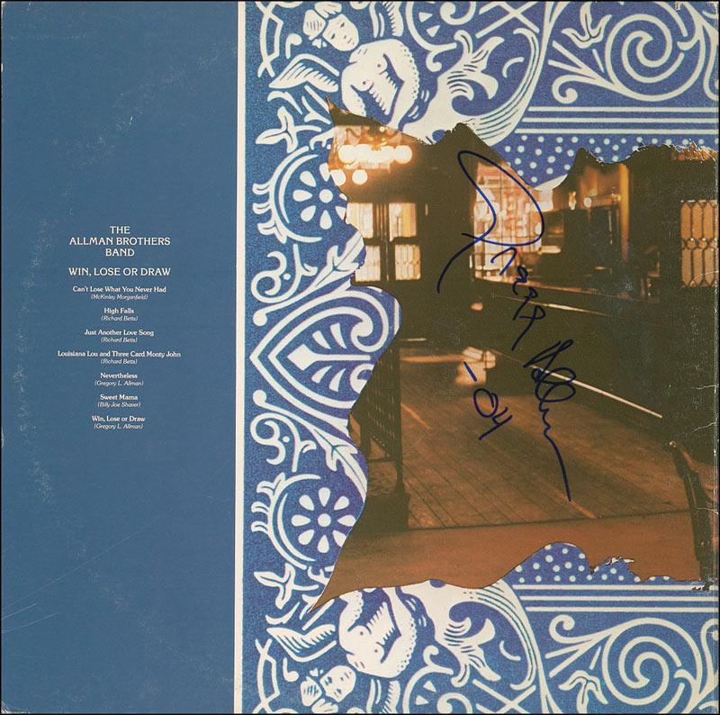 Win, Lose Or Draw album signed on the back cover in blue felt tip by Gregg Allman, and on the front cover by Dickey Betts and Jaimoe. In fine condition, with some scattered light cover wear. The record is included.