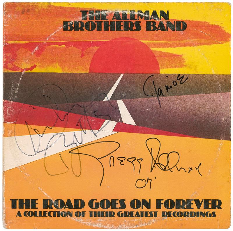 The Road Goes on Forever album signed on the front cover in felt tip by Gregg Allman, Dickey Betts, and Jaimoe. In very good condition, with moderate ‘ring of wear’ to covers, and scattered creases, soiling and edge wear. The record is included. Accompanied by a photo of Allman taken at time of signing.