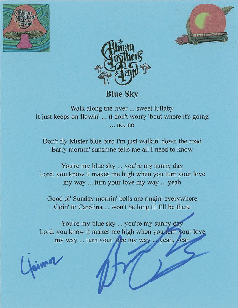 Souvenir printed lyrics to ‘Blue Sky,’ on a light blue 8.5 x 11 cardstock sheet, signed in blue felt tip by Jaimoe and Butch Trucks. In very fine condition.