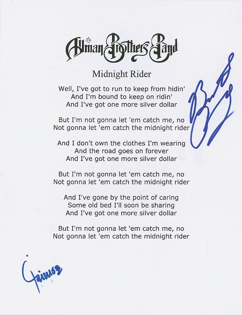 Printed souvenir lyrics to ‘Midnight Rider,’ on an off-white 8.5 x 11 sheet, signed in blue felt tip by Butch Trucks and Jaimoe. In fine condition.