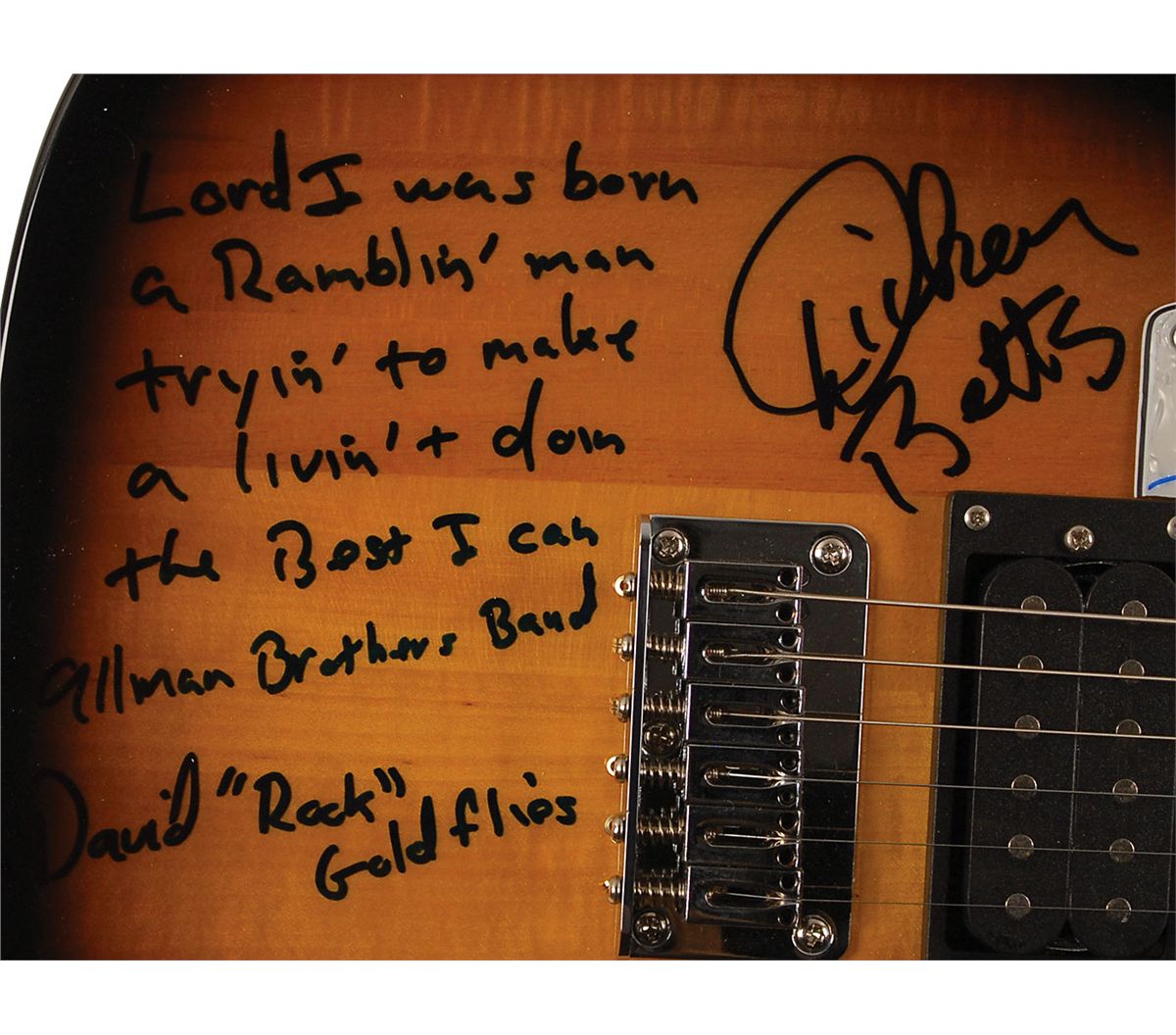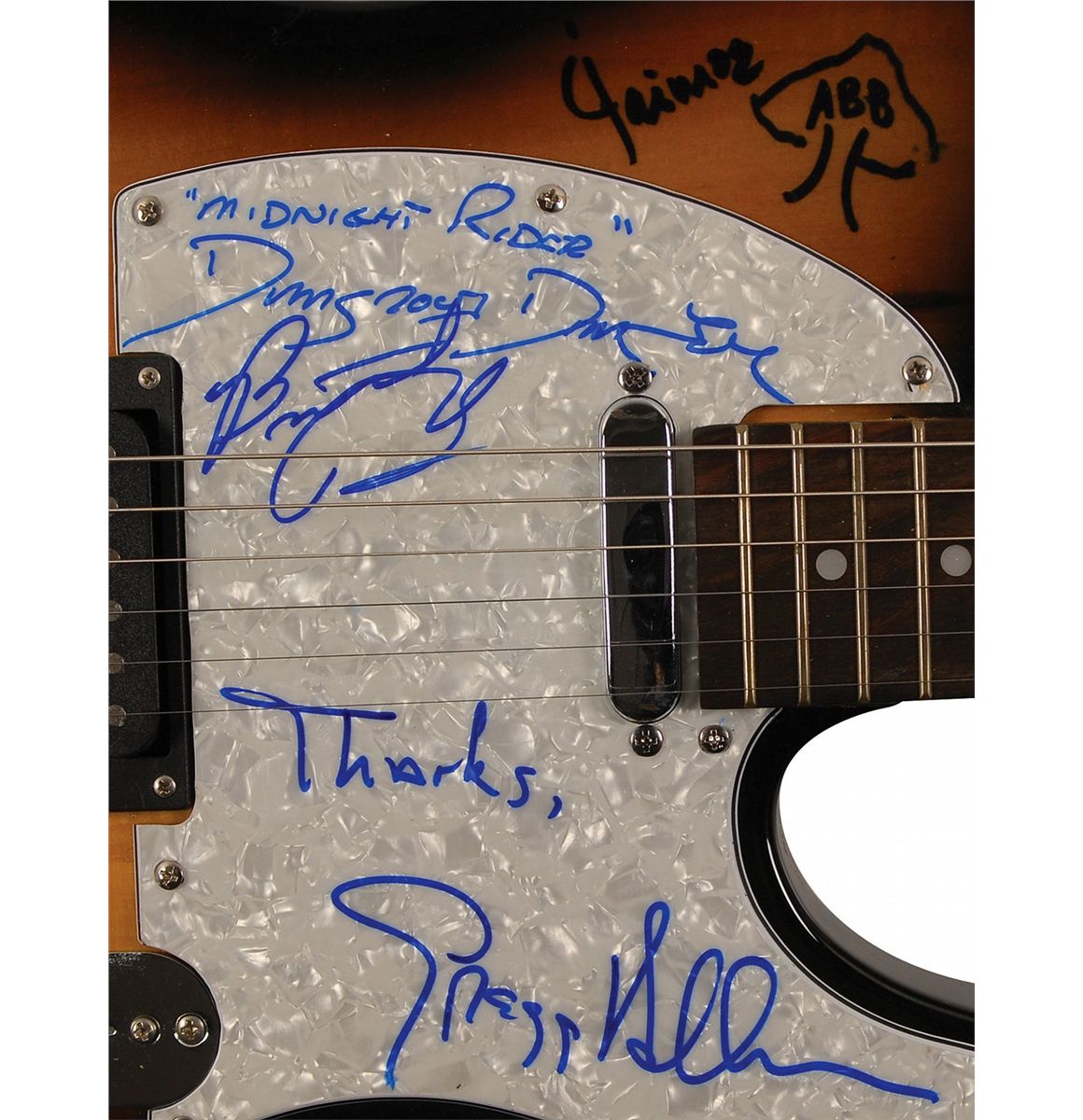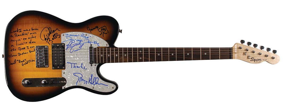 Sunburst-finish Fender Squier Tele ‘telecaster-style’ electric guitar, signed on the body in black felt tip by Dickey Betts, Jaimoe, adding a small sketch, and David Goldflies, adding the opening lyrics to ‘Ramblin’ Man, and signed in blue felt tip on the pearloid pickguard by Gregg Allman, ‘Dangerous’ Dan Toler, adding “Midnight Rider,” and Butch Trucks. In fine condition.