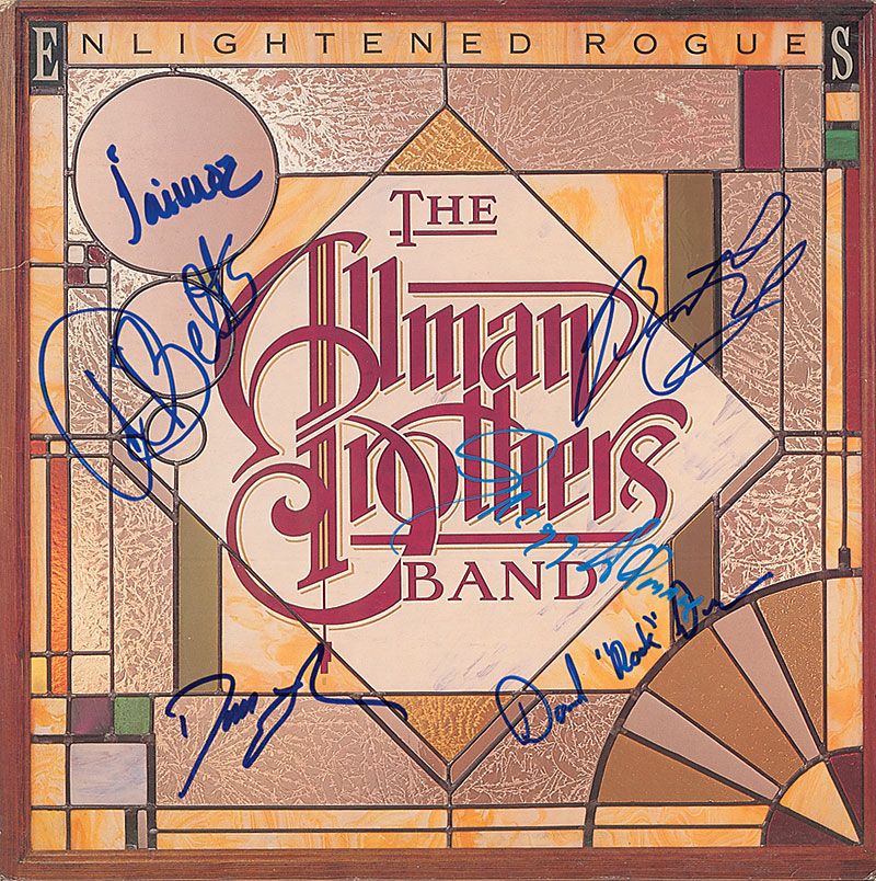 Enlightened Rogues album signed on the front cover in blue ink by Gregg Allman and in blue felt tip by Jaimoe, Dickey Betts, Butch Trucks, Dan Toler, and David ‘Rook’ Goldflies. In fine condition. The record is included.