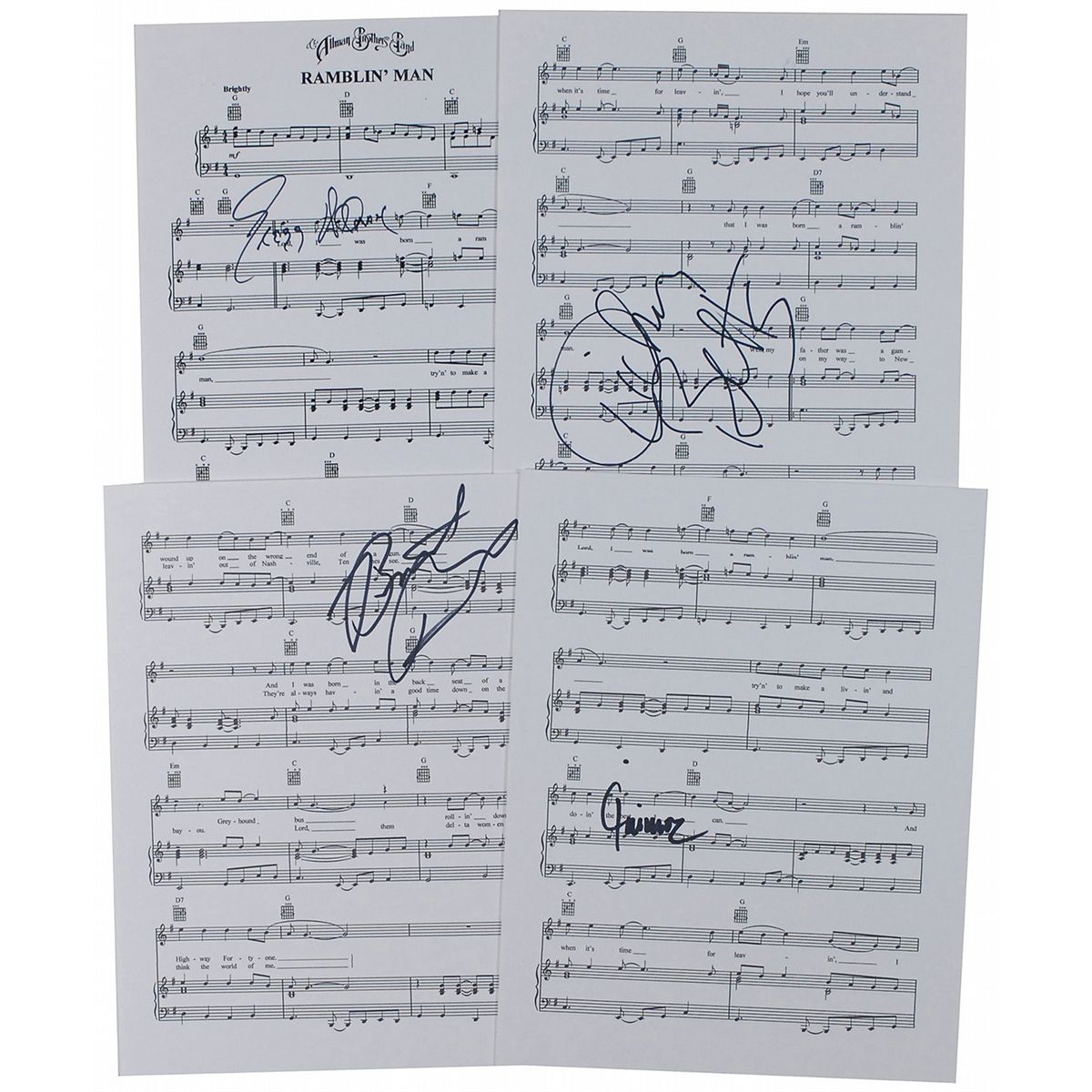 Printed sheet music to ‘Ramblin’ Man,” on five white 8.5 x 11 cardstock pages, signed in black felt tip by Greg Allman, Dickey Betts, Butch Trucks, and Jaimoe. In fine condition.