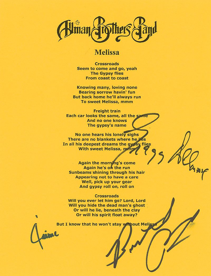 Souvenir printed lyrics to ‘Melissa,’ on a yellow 8.5 x 11 sheet of heavy stock, signed in black felt tip by Gregg Allman, Butch Trucks, and Jaimoe. In fine condition.