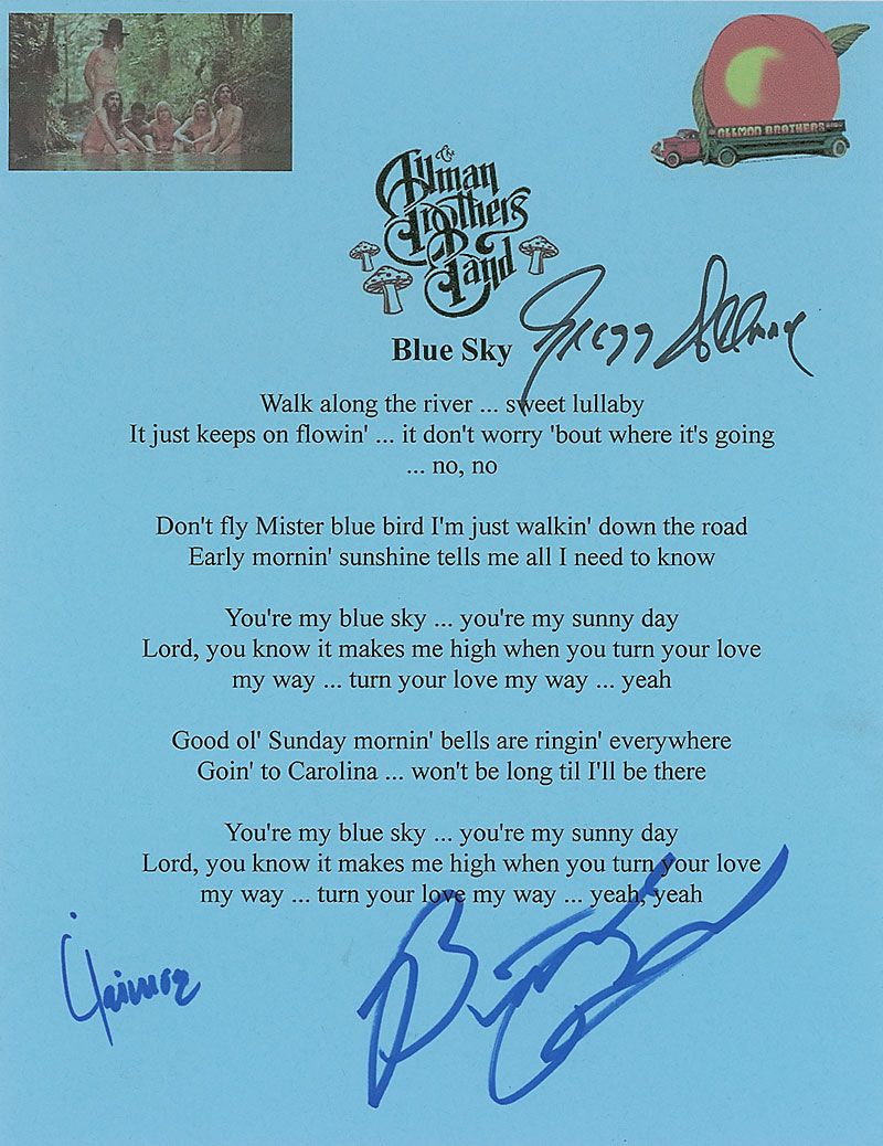 Souvenir printed lyrics to ‘Blue Sky,’ on a blue 8.5 x 11 sheet of heavy stock, signed in black felt tip by Gregg Allman, and in blue felt tip by Butch Trucks and Jaimoe. In fine condition.