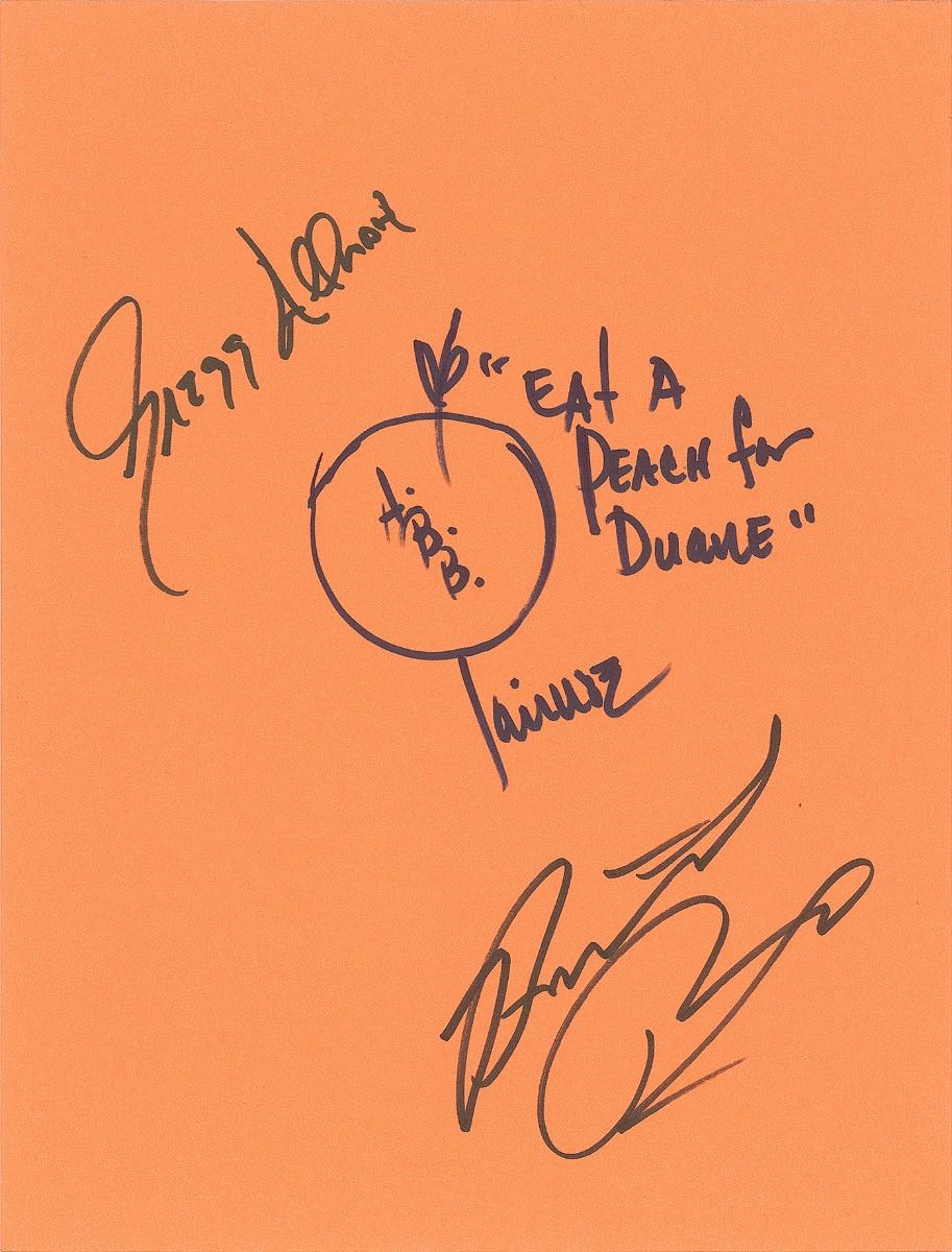 Felt tip signatures, “Gregg Allman,” “Butch Trucks,” and “Jaimoe,” who sketches a peach and adds, “‘Eat a peach for Duane,’” on a bright orange 8.5 x 11 sheet. In fine condition.