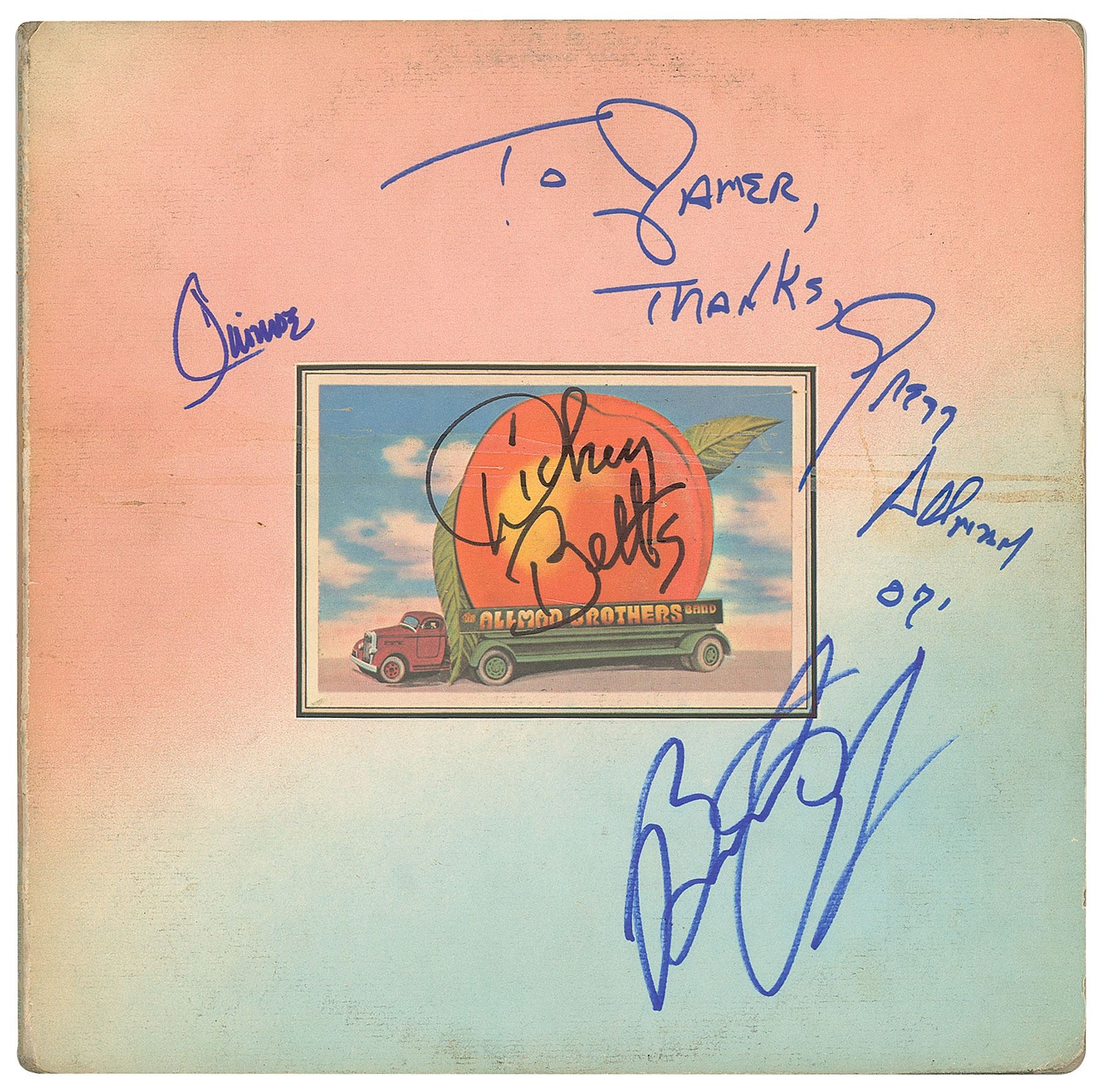 Eat a Peach album by The Allman Brothers Band, signed and inscribed on the front cover in blue felt tip, "Thanks, Gregg Allman, 07," "Dickey Betts," "Butch Trucks," and "Jaimoe." In very good to fine condition, with light scuffing, and some light stains. The record is included.
