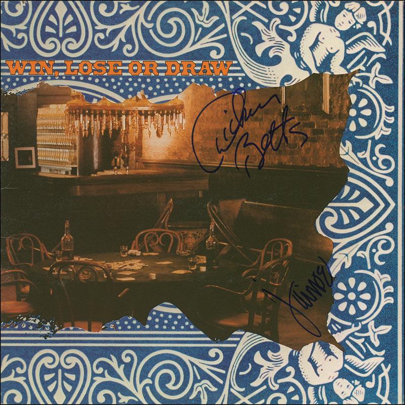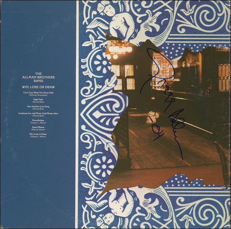 Win, Lose Or Draw album signed on the back cover in blue felt tip by Gregg Allman, and on the front cover by Dickey Betts and Jaimoe. In fine condition, with some scattered light cover wear. The record is included.