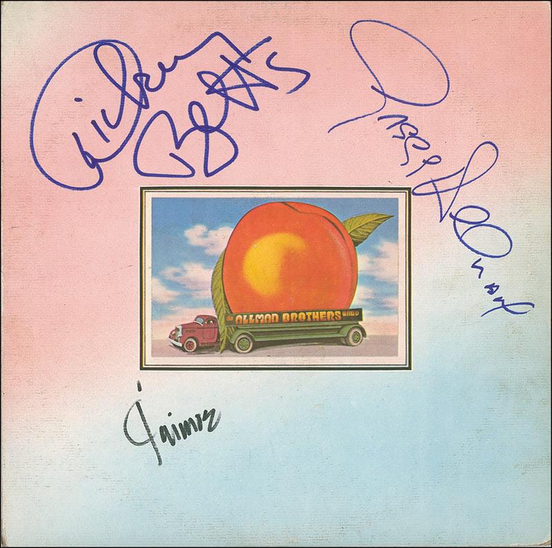 Eat a Peach album boldly signed on the front in blue felt tip by Gregg Allman and Dickey Betts, and in black felt tip by Jaimoe Johanson (signed “Jaimoe”). In very good condition, with separations along the top and bottom of the album, and scattered soiling. The records are included.
