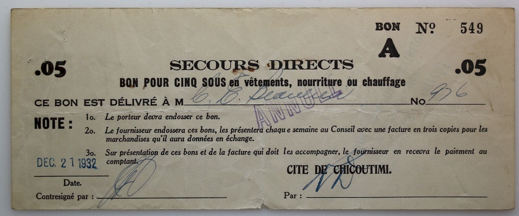 Allocation de Chomage Issue; Cité de Chicoutimi, 5 Cents 1932, Secours Directs, #549,