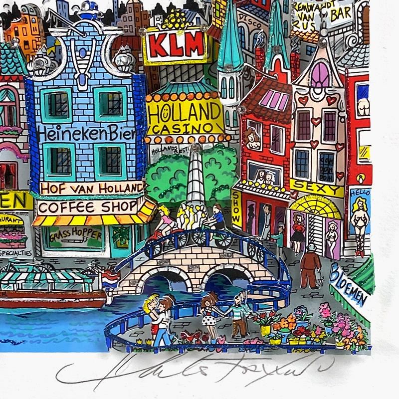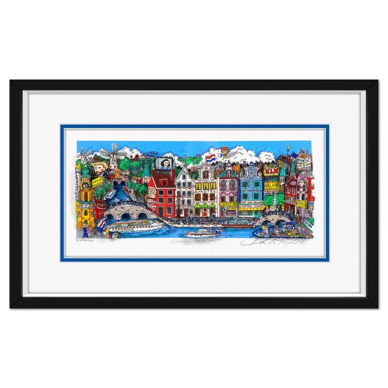 "Alluring Amsterdam" is a 3D limited edition silk screen construct on paper by Charles Fazzino, DX numbered 384/400 and hand signed by the artist. This piece comes custom framed. Includes Certificate of Authenticity. Measures approximately 15" x 24" (frame), 6.5" x 16" (image).