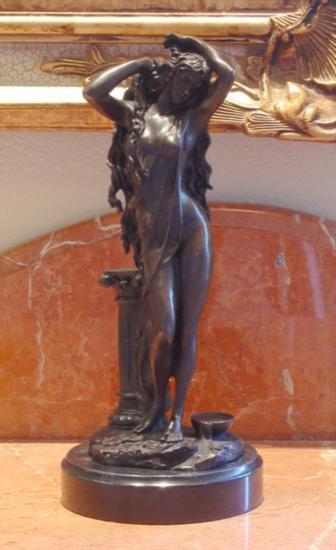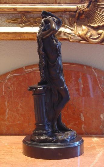 Single Standing Goddess, Bronze Sculpture, 12 1/2"H x 5"W x 5D 12 lbs This bronze sculpture was produced using the "Lost Wax" casting method. The"Lost Wax" Cast method is the most precise metal casting technique in existence, ensuring exquisite detail of the original host model which is usually sculpted in clay or wax. This "Lost Wax" casting method is an extremely labor intensive and expensive process, but the end results produce a Heirloom Quality Masterpiece!