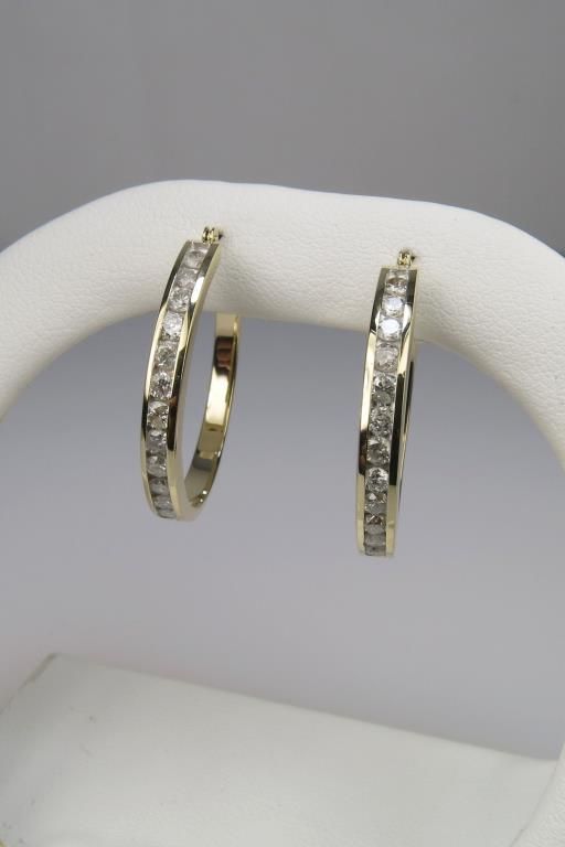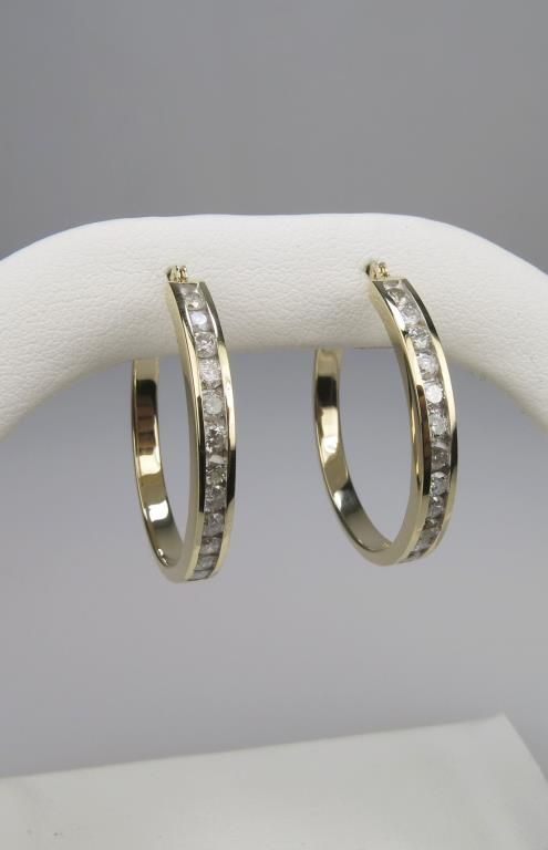 Alluring Diamond Hoop Earrings with 24 channel set round cut Diamonds weighing approx. 0.80 carats with H-I colors and SI/I clarity set in 14 karat yellow gold. Retail $1,000-$1,500 Estimate $800-$1,200.