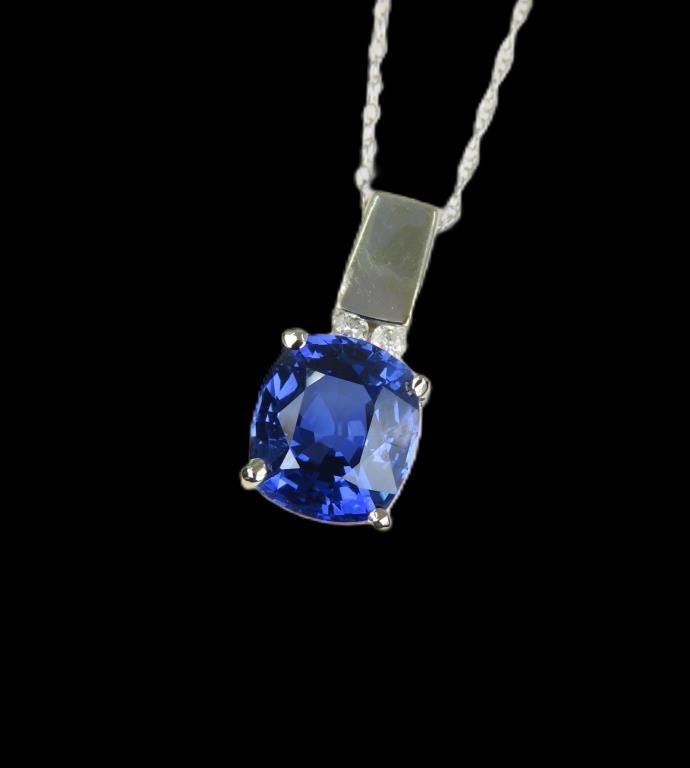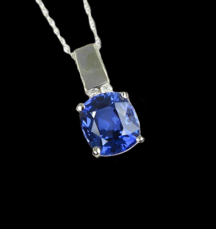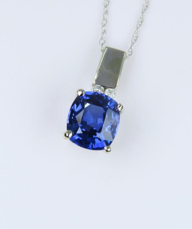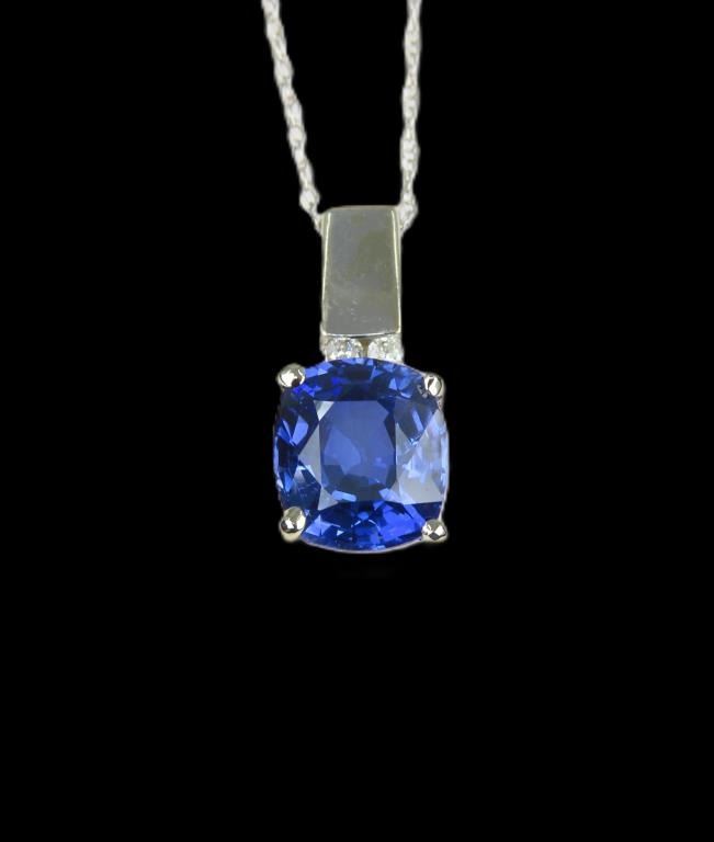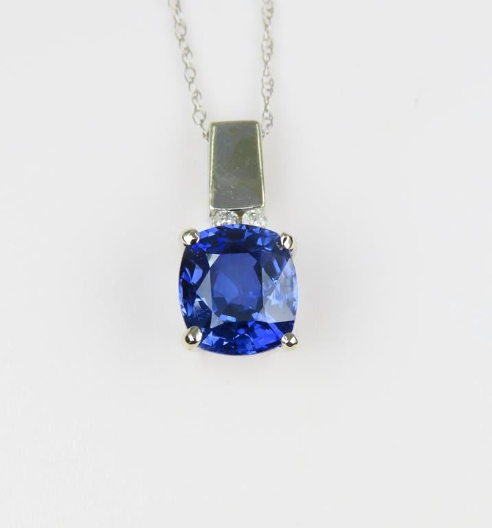 Sapphire and Diamond Pendant featuring a Sapphire weighing 2.45 carats accented with 2 round cut channel set Diamonds set in a 14 karat white gold contemporary setting.