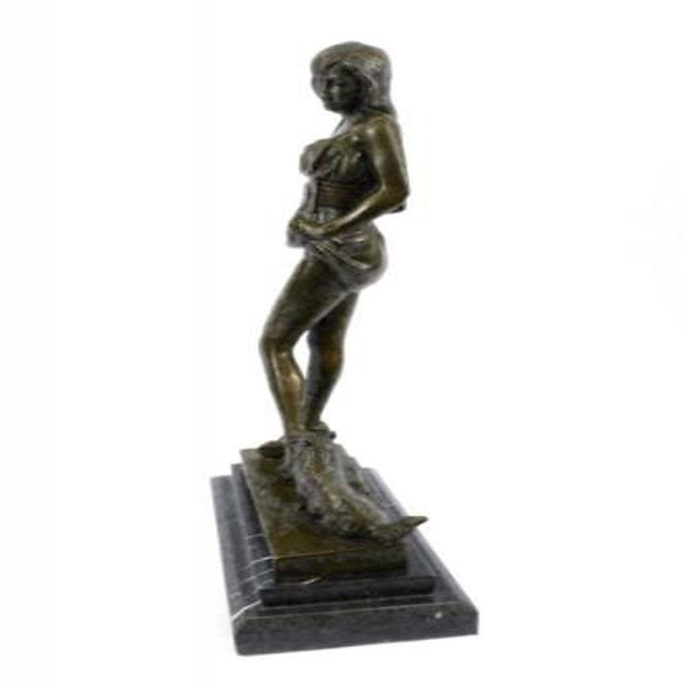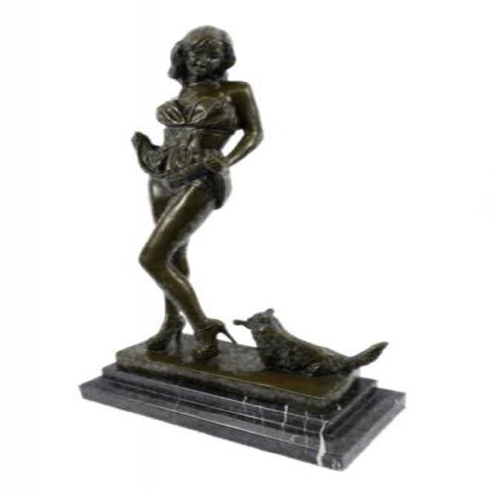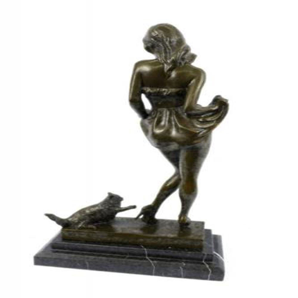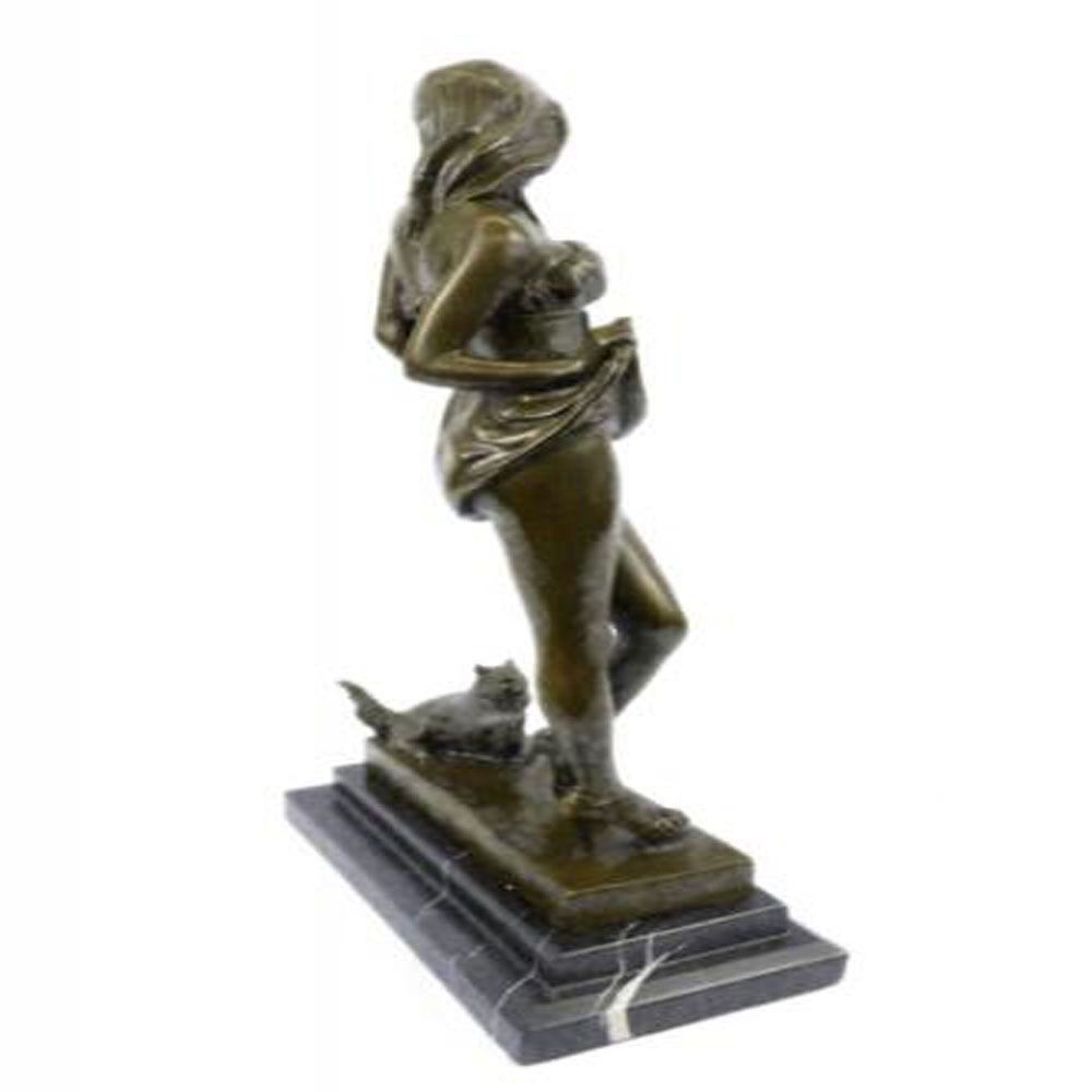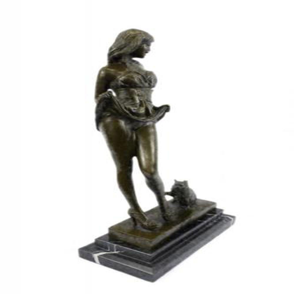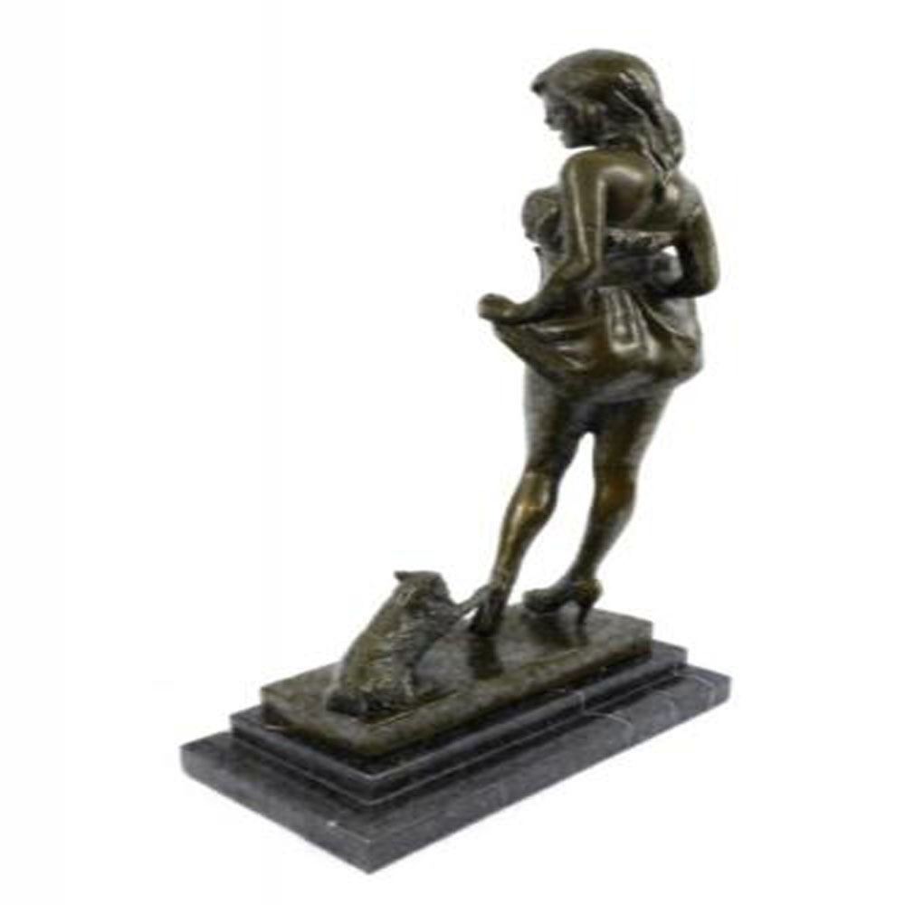 This sculpture combines a sense of playfulness and sexiness. The alluring woman, upon returning home, begins to disrobe as her cat playfully greets her at her feet. Both of her hands are suspended by her waist holding the hems of her dress revealingly. Her head cocks to her left admiringly surprised to find her furry cat who is tapping the heel of her stilettos. The bronze beauty was cast using the age-old method of lost wax casting and stained with a brown patina finish and she seduces upon a marble base. Dimensions: Height 16 X Width 9 Inches. Weight: 15 LBS.