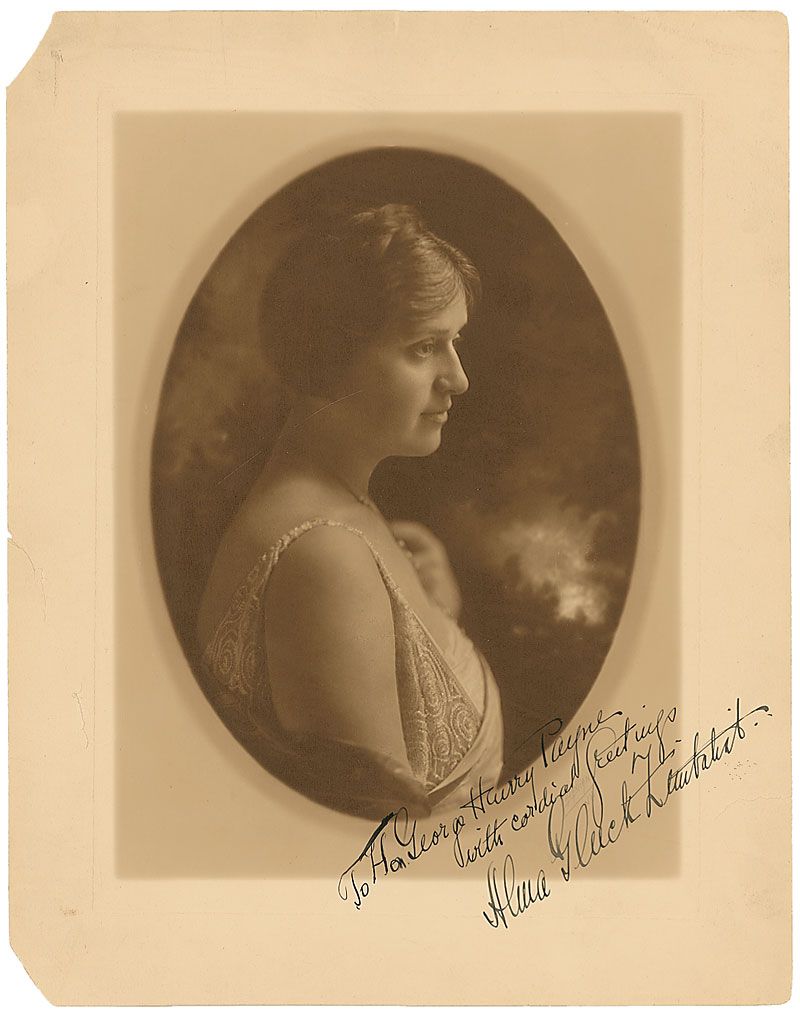 Vintage matte-finish 11 x 14 photo of the famed soprano, signed and inscribed in fountain pen, “To Hon. George Harry Payne, with cordial greetings, Alma Gluck Zimbalist.” In very good condition, with a few edge tears and paper loss to left corners.