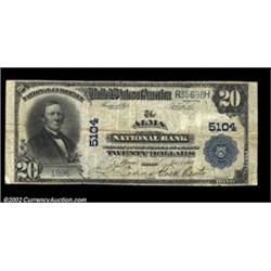 Alma, KS - $20 1902 Plain Back Fr. 658 The Alma NB Ch. # 5104Attractive pen signed Fine-Very Fine example from this scarce bank. Important notice: We expect to be auctioning lots at the rate of 200-250 per hour. Sometimes eBay Premier live bid software cannot keep up with that pace, so we strongly recommend that you place a realistic proxy bid now as insurance to avoid disappointment. Also please note that all Heritage/CAA lots purchased through eBay Premier carry a 20% Buyer's Premium. Please make sure you read the Terms and Conditions.