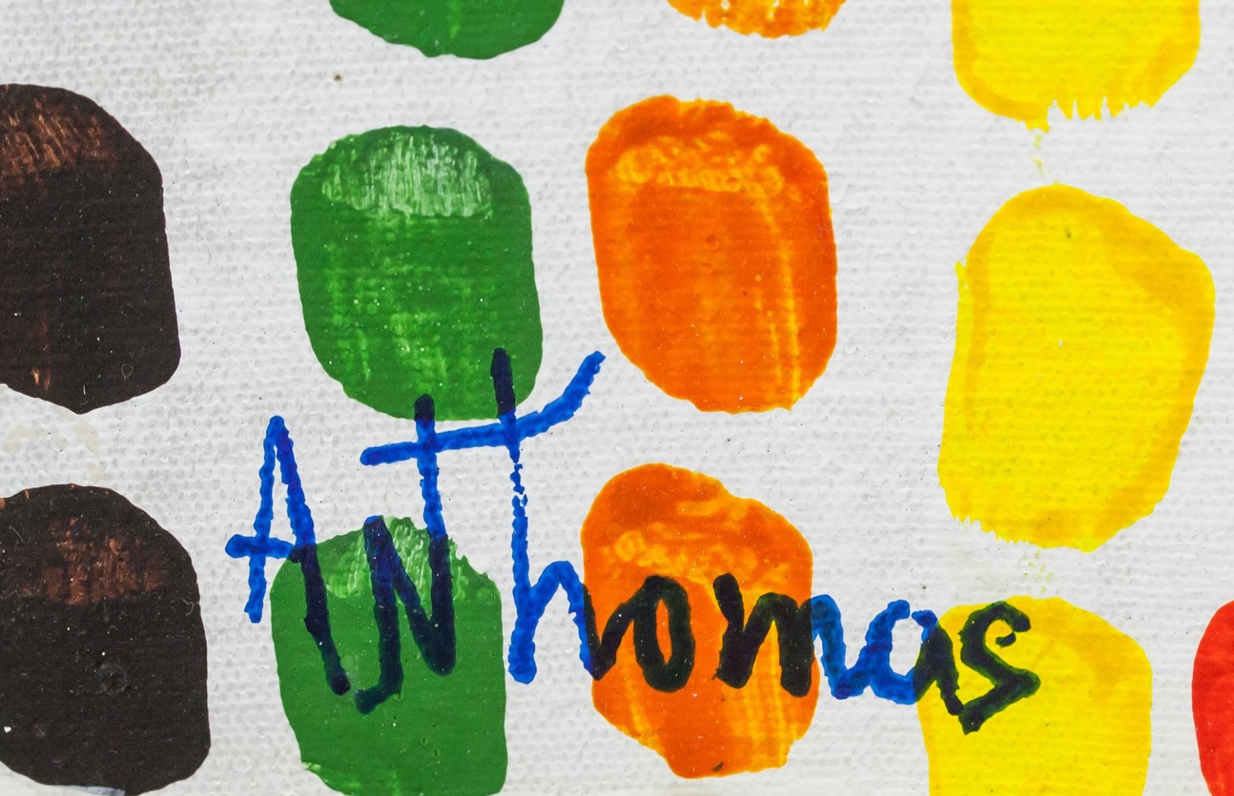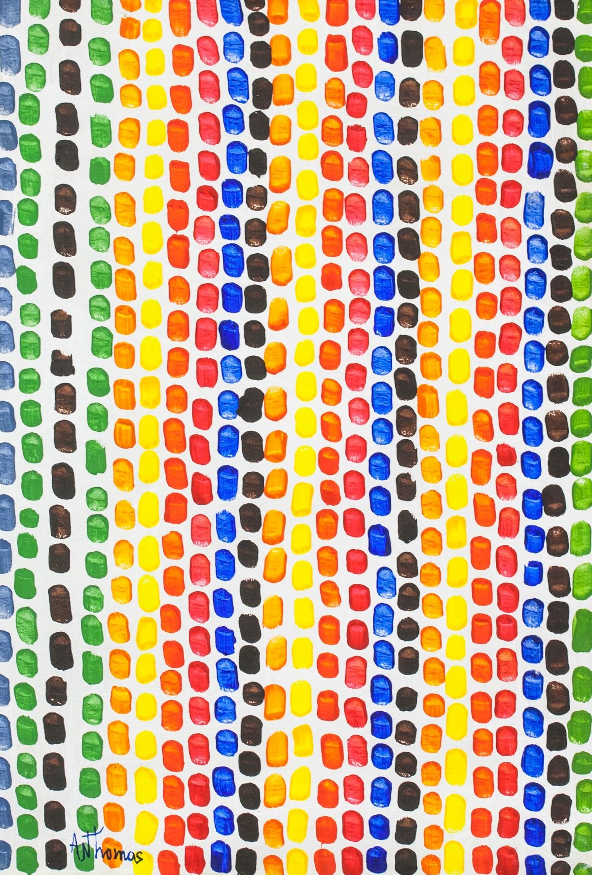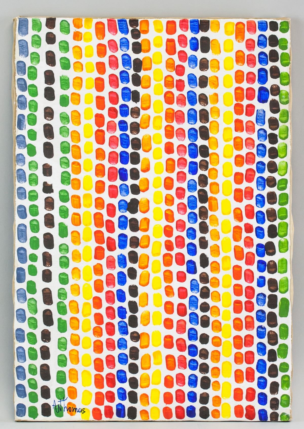 Oil on canvas. Featuring rows of colorful dots on white background. Signed "A N Thomas" in the bottom left corner. Attributed to Alma Thomas (1891-1978, African-American). 58 x 40 cm (22.75 x 15.5 in).