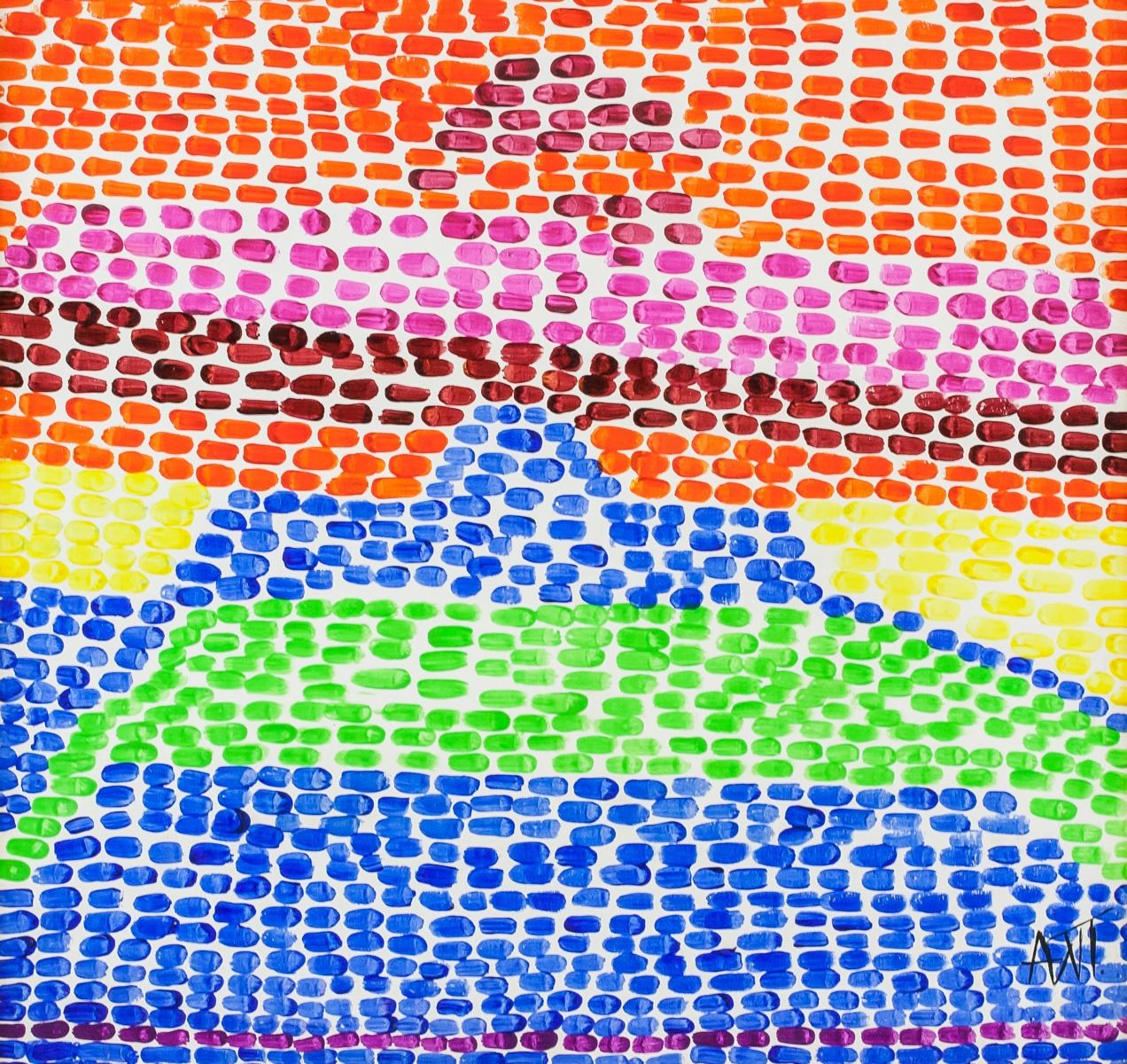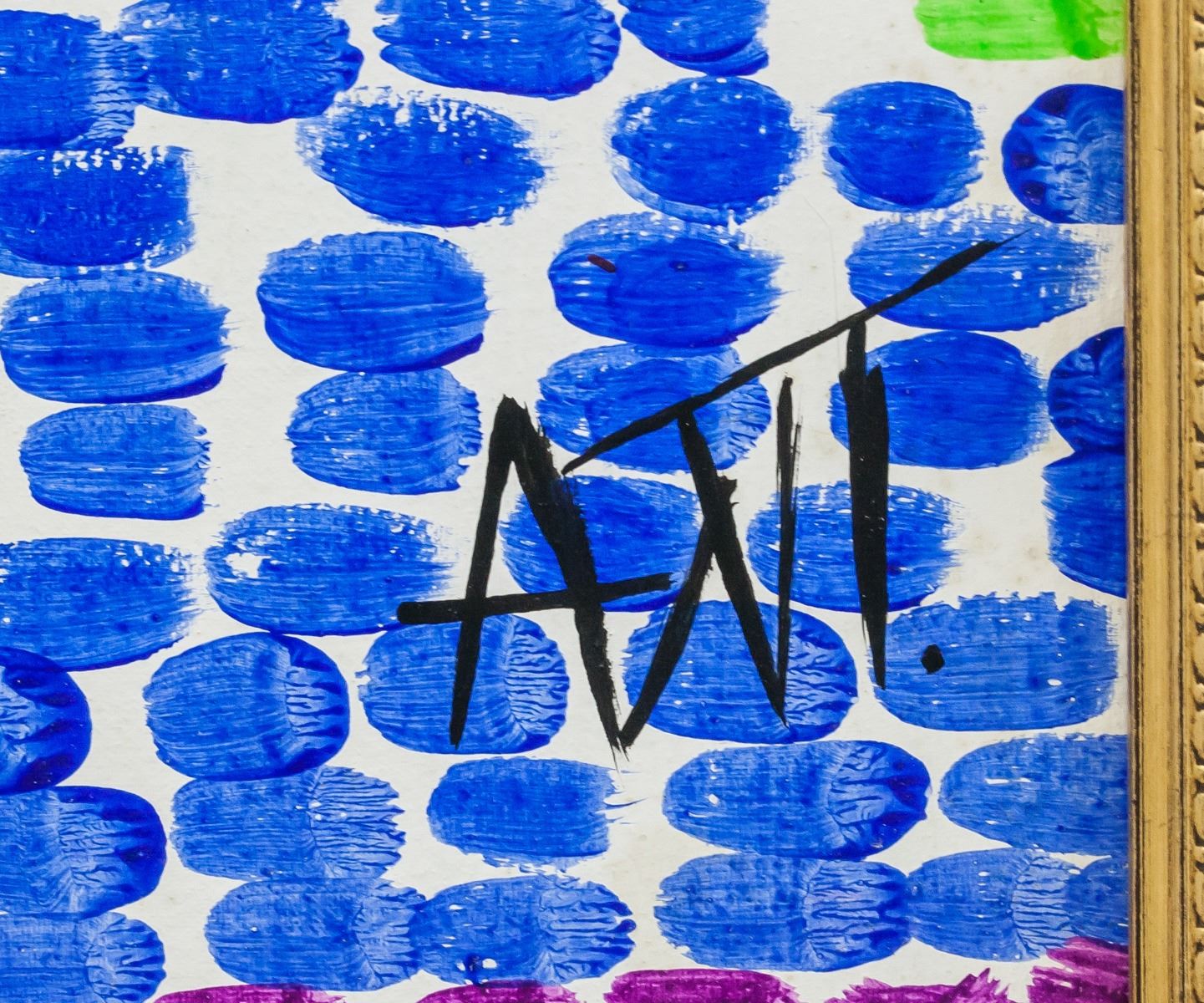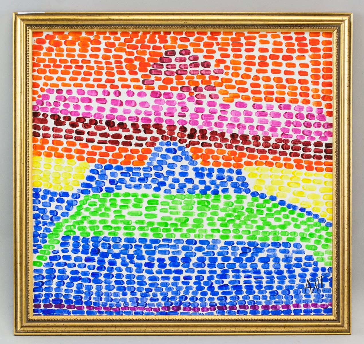 Oil on canvas, framed. Featuring an abstract expressionist landscape composition. Signed with initals AT on the lower right corner. Attributed to Alma Thomas (1891-1978, American). 48 x 50 cm (19 x 19.75 in), Frame: 53 x 56 cm (21 x 22 in). PROVENANCE: This lot carries limited provenance from a Southern Ontario estate