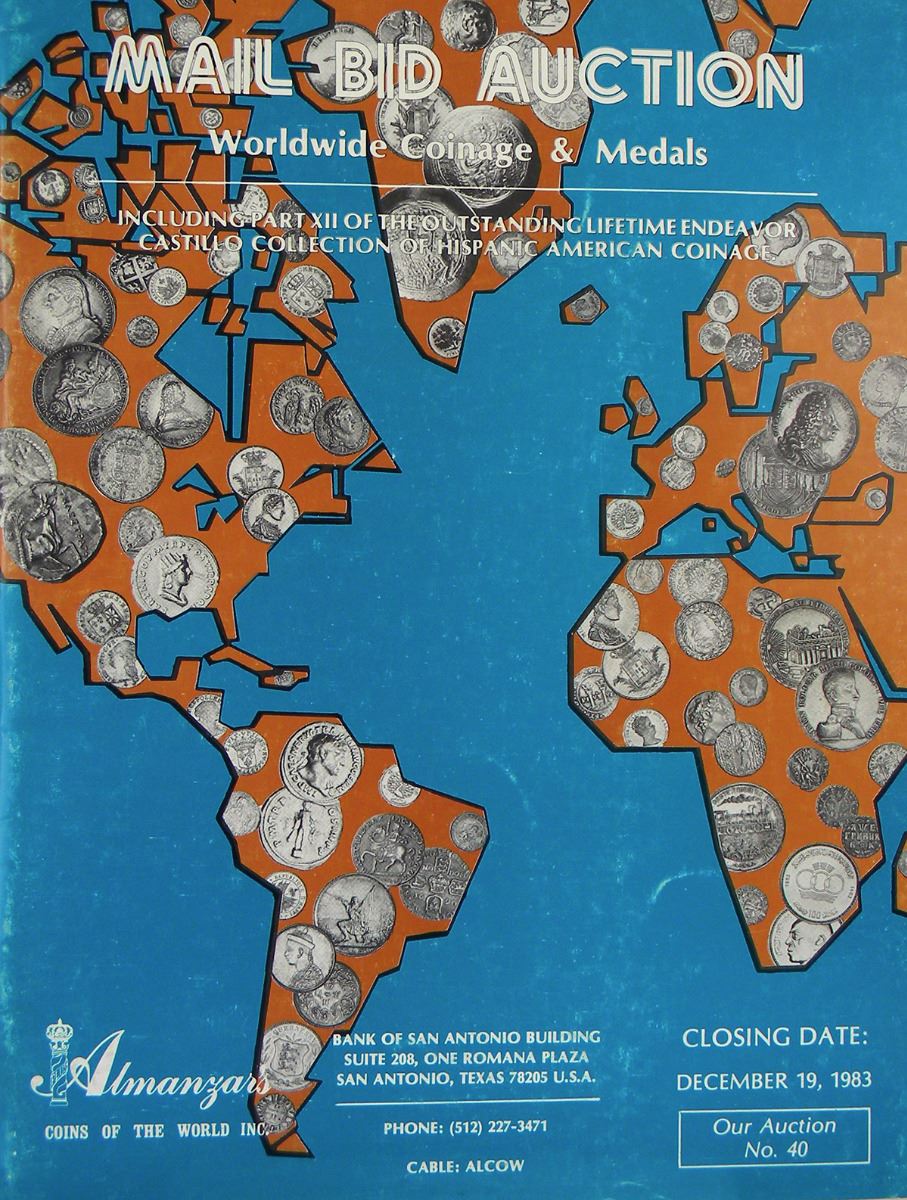 Almanzar’s. AUCTION CATALOGUES. San Antonio, etc., 1971-84. A nice group of twenty-three sales, being Sales 3-8 and 25-41. 4to, original printed or pictorial card covers. Nearly all with original prices realized lists. Generally fine. [with] El Dorado Coin Galleries. AUCTION SALES. Nos. 1-10 and 12. San Antonio etc., 1984-86. Some with prices realized lists. [with] Coins & Antiquities Ltd. AUCTION SALES. Seven sales continuing the El Dorado series. San Antonio etc., 1986-87. All generally fine. A substantial run of Almanzar catalogues, perhaps most important for Latin American coins and paper money. The El Dorado and Coins & Antiquities sales also feature Latin American material and a wide variety of foreign coins and medals.