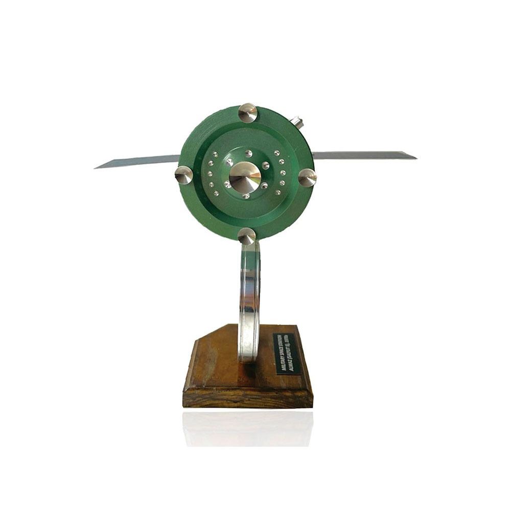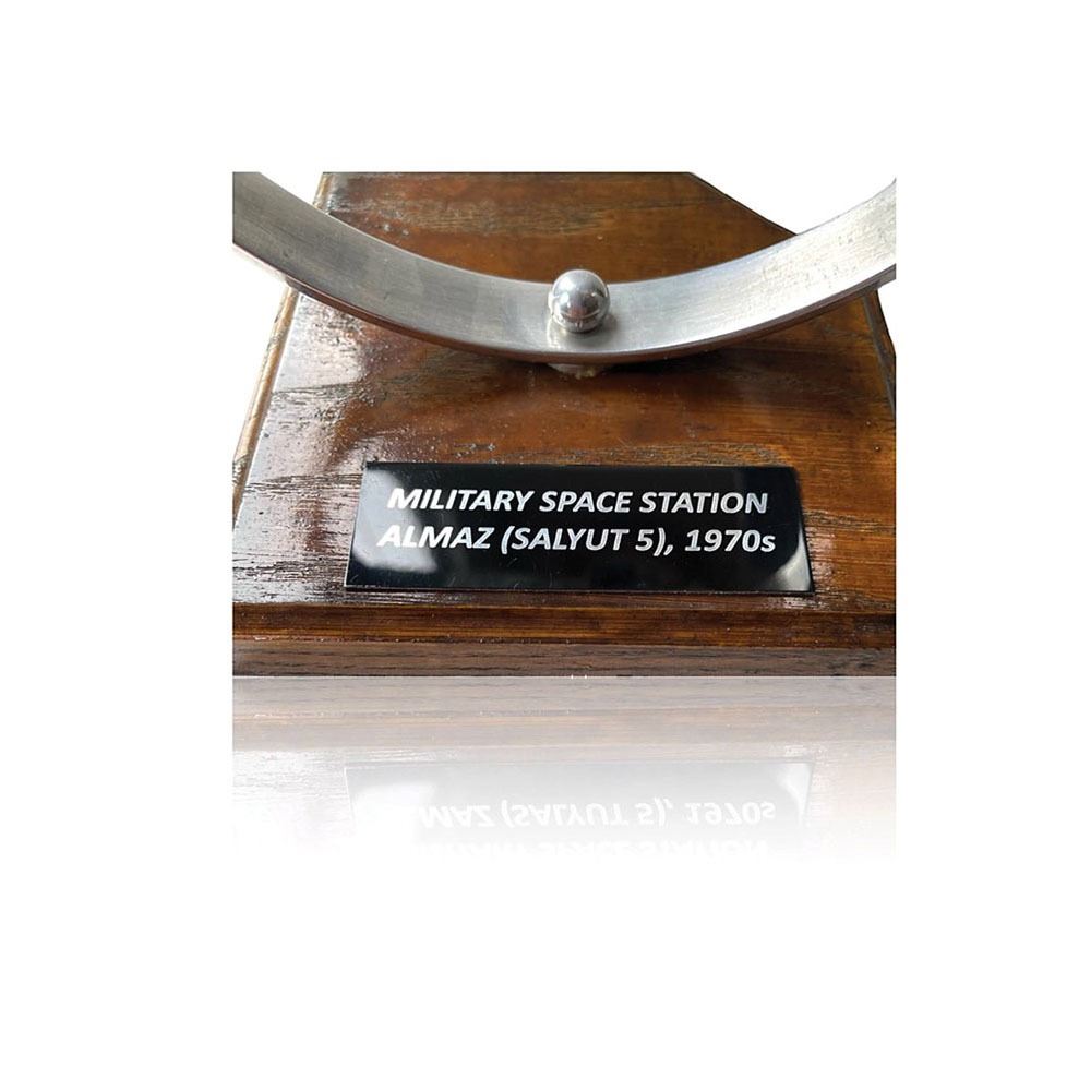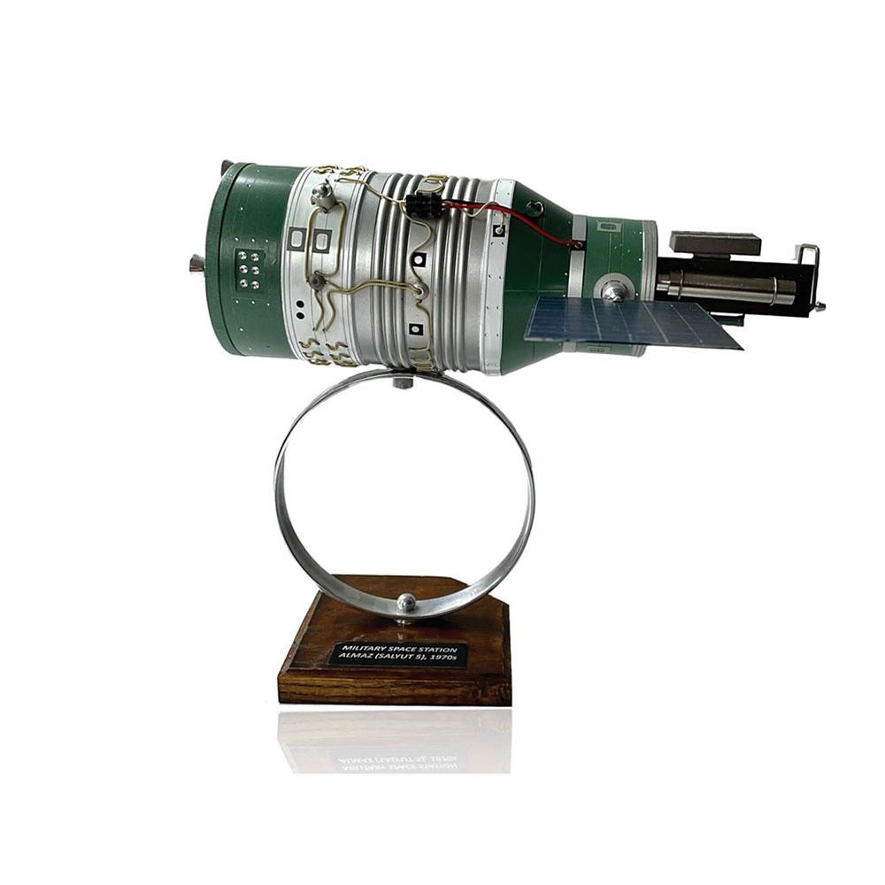 Scale model of the Almaz (Salyut 5) Military Space Station, measuring approximately 10.5è x 3.5è x 12.5è, mounted on a metal ring stand with wooden base. In fine condition.