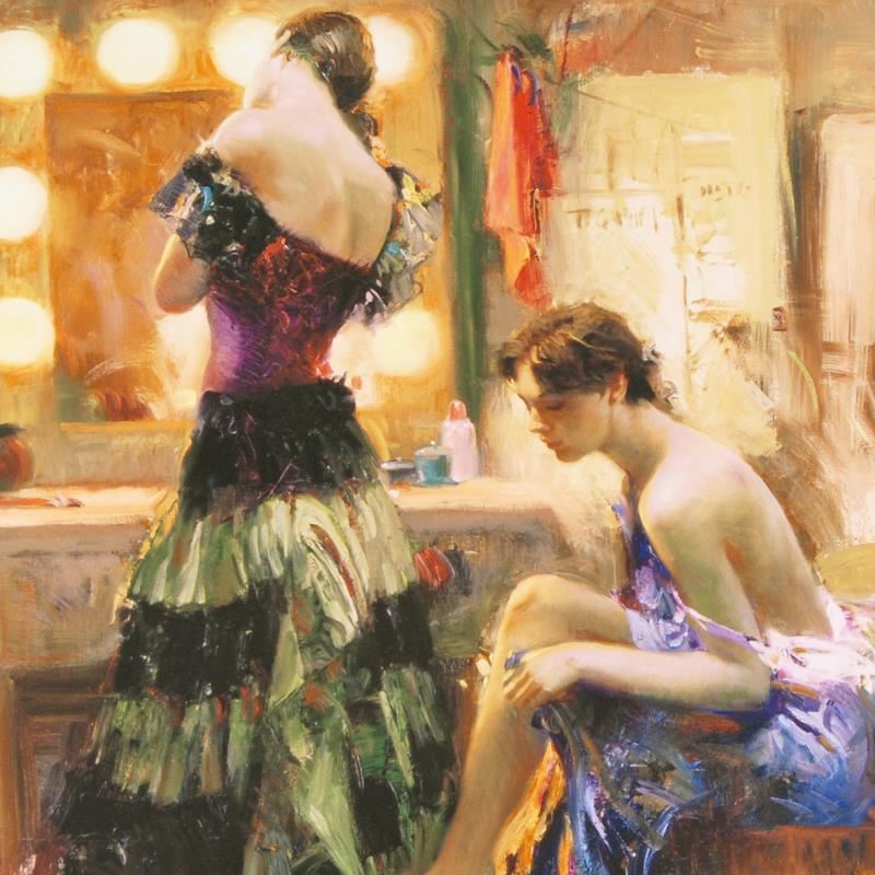 "Almost Ready" is a limited edition giclee on canvas by Pino (1939-2010), numbered and hand signed by the artist. Includes Certificate of Authenticity. Measures approx. 16" x 20" (image).