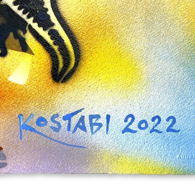 "Aloft Again" is an original painting, mixed media on paper by Mark Kostabi. Hand Signed by the artist, the piece comes framed and with letter of authenticity. Measures approximately 35.5" x 47.5" (framed), 29.5" x 41.5" (image).