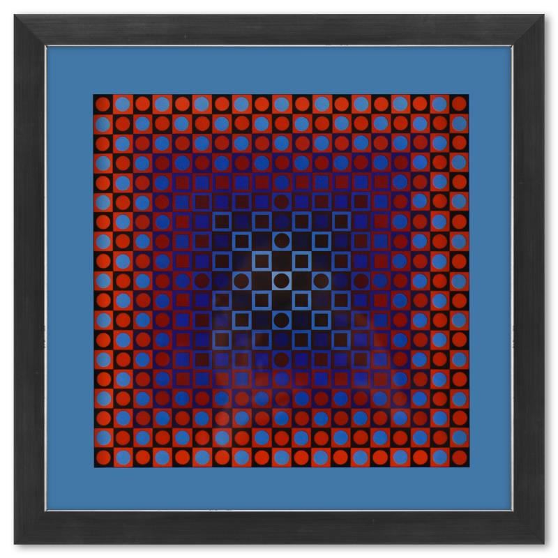 "Alom (Blue/Red) de la serie Folklore Planetaire" is a heliogravure print on paper published in 1971 by Victor Vasarely (1908-1997). This piece comes custom framed with a letter of authenticity and with a 1976 Vasarely paperback. Measures approx. 11.5" x 11.5" (frame) 9" x 9" (image).