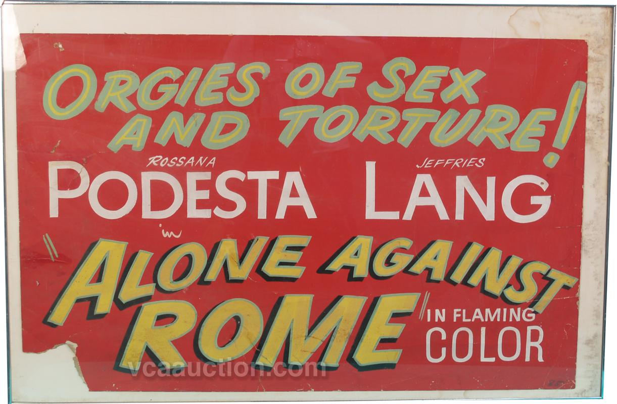 "Alone Against Rome" Cardboard Movie Poster "Orgies Of Sex And Torture!" Starring Rossana Podesta & Jeffries Lang, in frame - 39" x 25"
