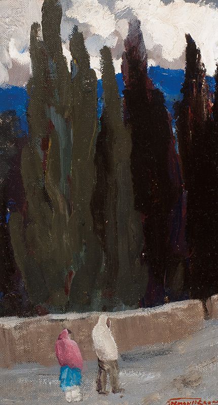 Fremont Ellis, 1897 - 1985 Los Cincos Pintores | Signed: Freemont Ellis, l/r | Media: Oil on canvas board | Dimensions: 11 by 6 inches