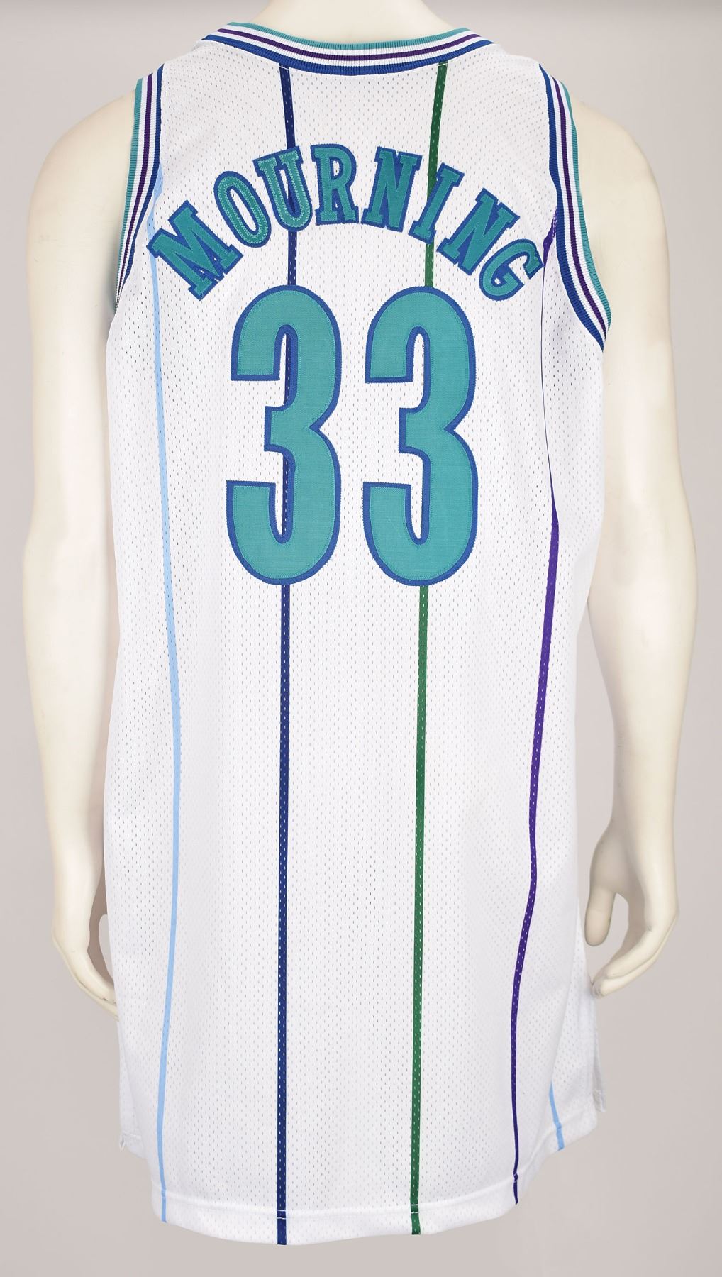 Alonzo Mourning's game-used Charlotte Hornets pinstriped away jersey from the 1994–95 season. The mesh jersey features "Charlotte" and his number "33" on the front, and "Mourning" and "33" on the back. The front tail has the Champion tag indicating size 50, and Charlotte Hornets tag noting alterations, "Body Length +4." In fine condition.