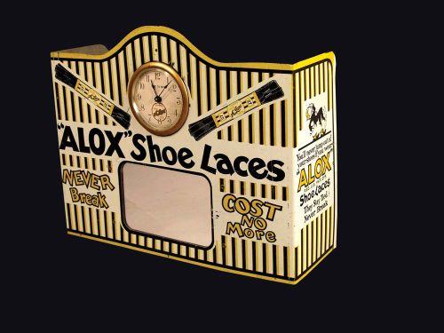 Alox Shoelace Tin Store Display with mirror clock. Minor scratches otherwise excellent condition. 14 1/2 X 12 X 5 inches.
