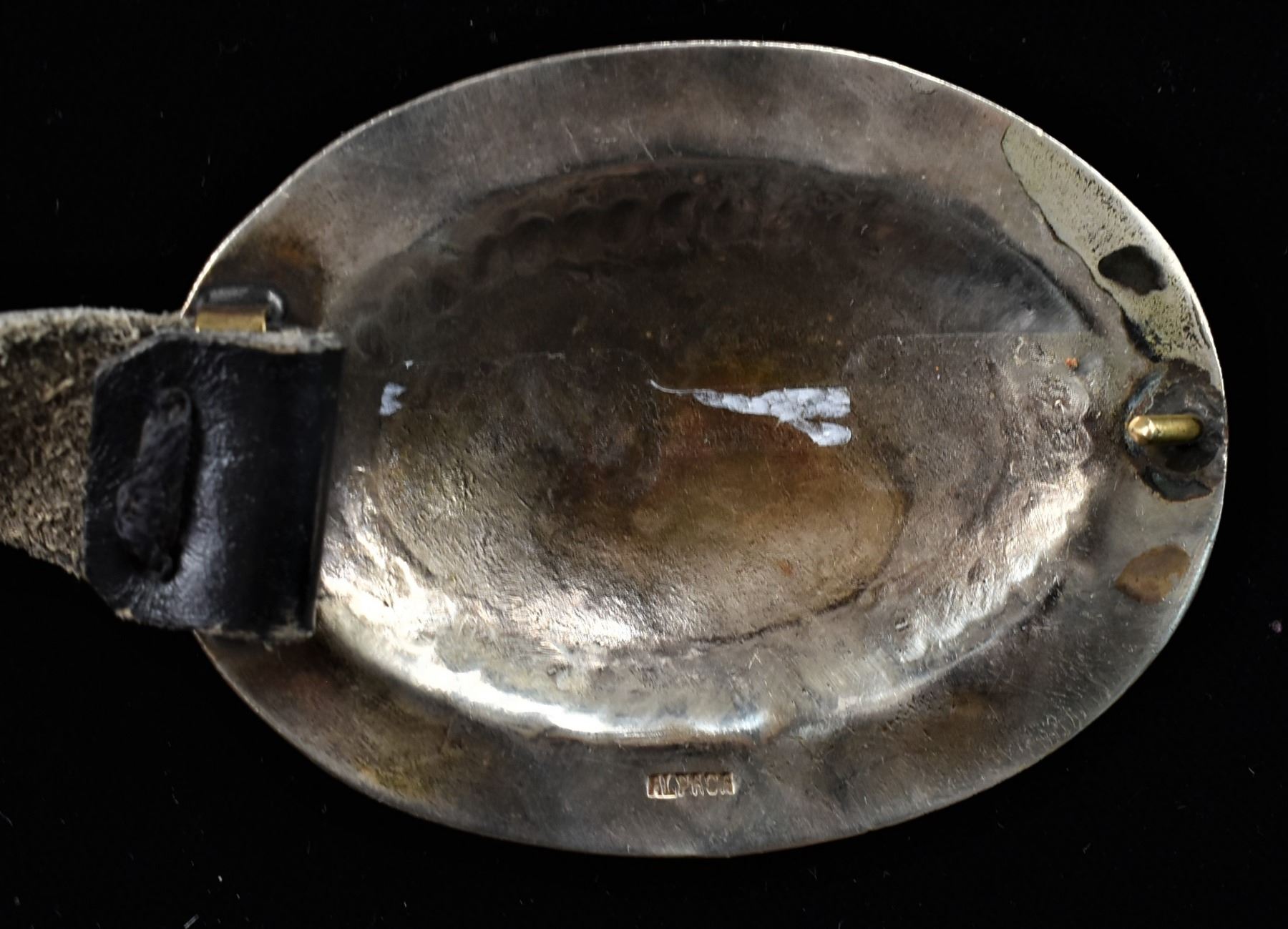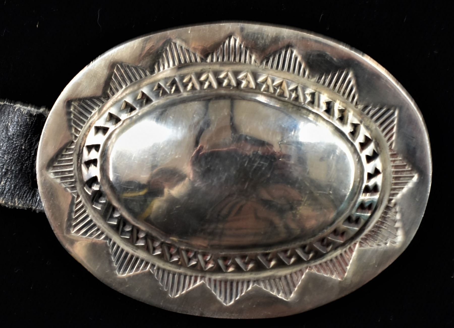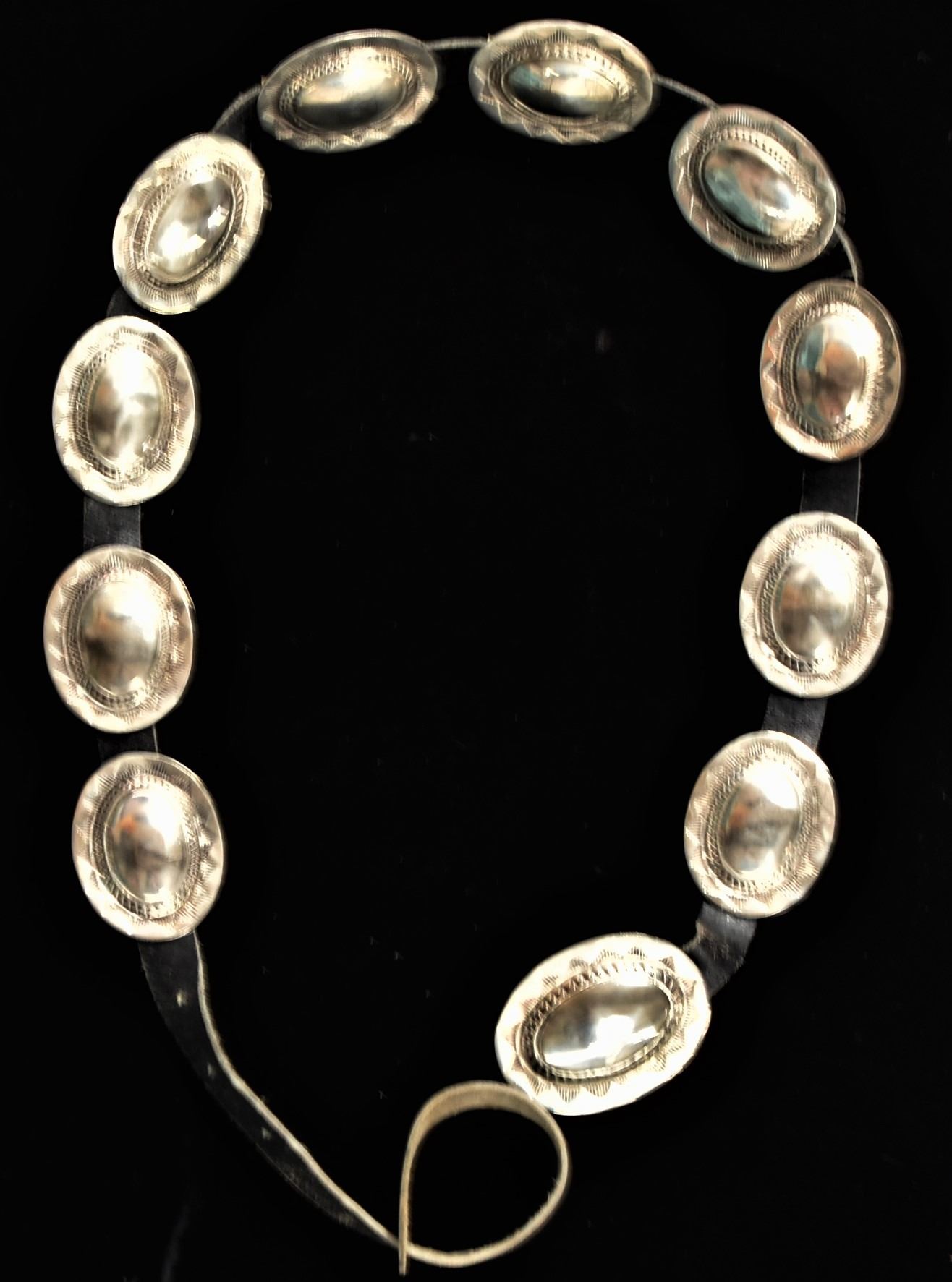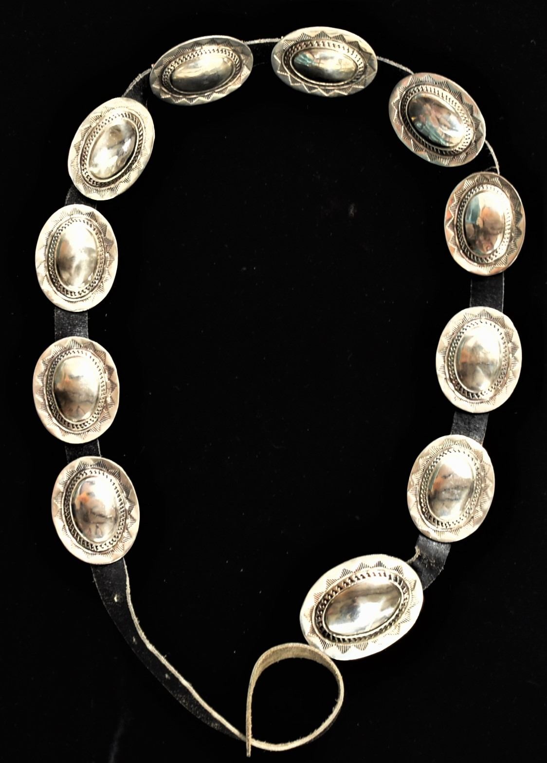 Alpaca Concho Belt, buckle is marked Alpaca, features 10 conchos and buckle on leather belt, belt measures 48''L end to end x 7/8''W, conchos measure 2 1/8'' x 2.75''L, buckle measures 3 1/8''L x 2 3/8''W, total gram wt. of 365