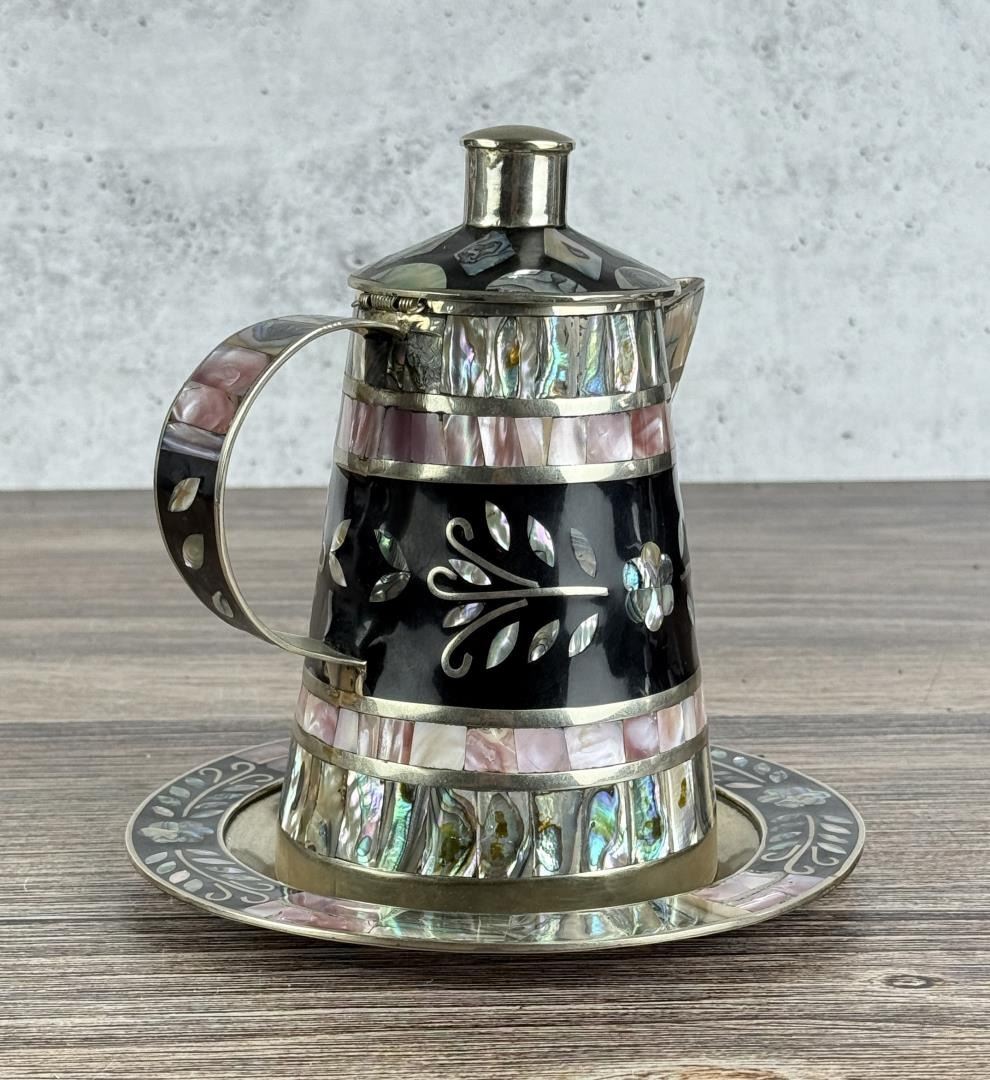 Pot is 6 3/8" tall by 3 3/4" in diameter. Plate is 6 1/2" in diameter.
