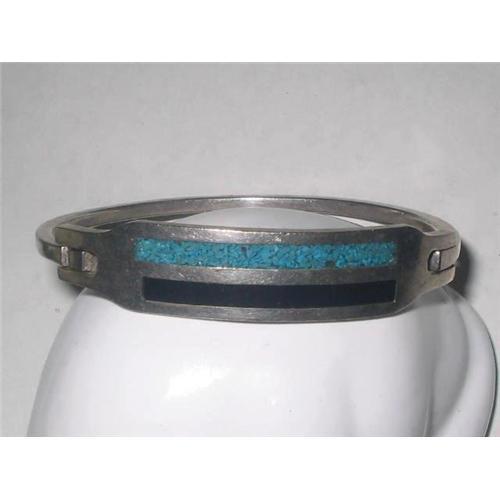Lovely contemporary design, turquoise and onyx inlay on the front. Marked Alpaca Mexico. Measures 2-1/2" x 2-1/4" (inside measurement). Opens at the front. Excellent condition. Please check out my other jewellery from Mexico.