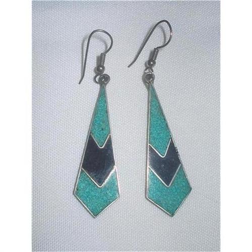 Lovely dramatic long dangle earrings for pierced ears from Alpaca Mexico with black Onyx inlay in the Southwestern Aztec style. Turquoise chip or crushed turquoise, as it is sometimes referred to, with the Onyx inlay at the centre in a "V" shaped design. Earrings measure 1-3/4" long and have french wires for pierced ears. Marked on the back Alpaca Mexico. Minor wear to the metal and patina consistent with age.