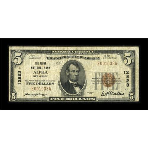 <B>Alpha, NJ</B></I> - $5 1929 Ty. 1 <B>The Alpha NB</B></I> Ch. # 12823<BR> This banking institution in Warren County was liquidated in early 1933 after issuing a modest number of notes. The last example we handled from this bank was a Fine example that realized over $2100. This slightly better <B>Fine-Very Fine </B></I>piece is likely to exceed that price realized in its first ever public auction appearance.<BR><BR><b>Shipping:</b> Coins & Currency (<a target="_blank" href="http://www.heritageauctions.com/common/shipping.php">view shipping information</a>)