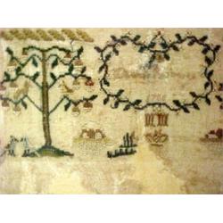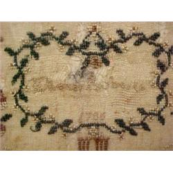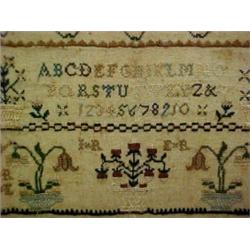 Alphabet sampler, dated 1786, alphabet over numerals, flowers and verse, signed (unreadable) over date, some loss, measures approximately 19 1/2" x 13 1/2", in walnut frame Estimate 400/900