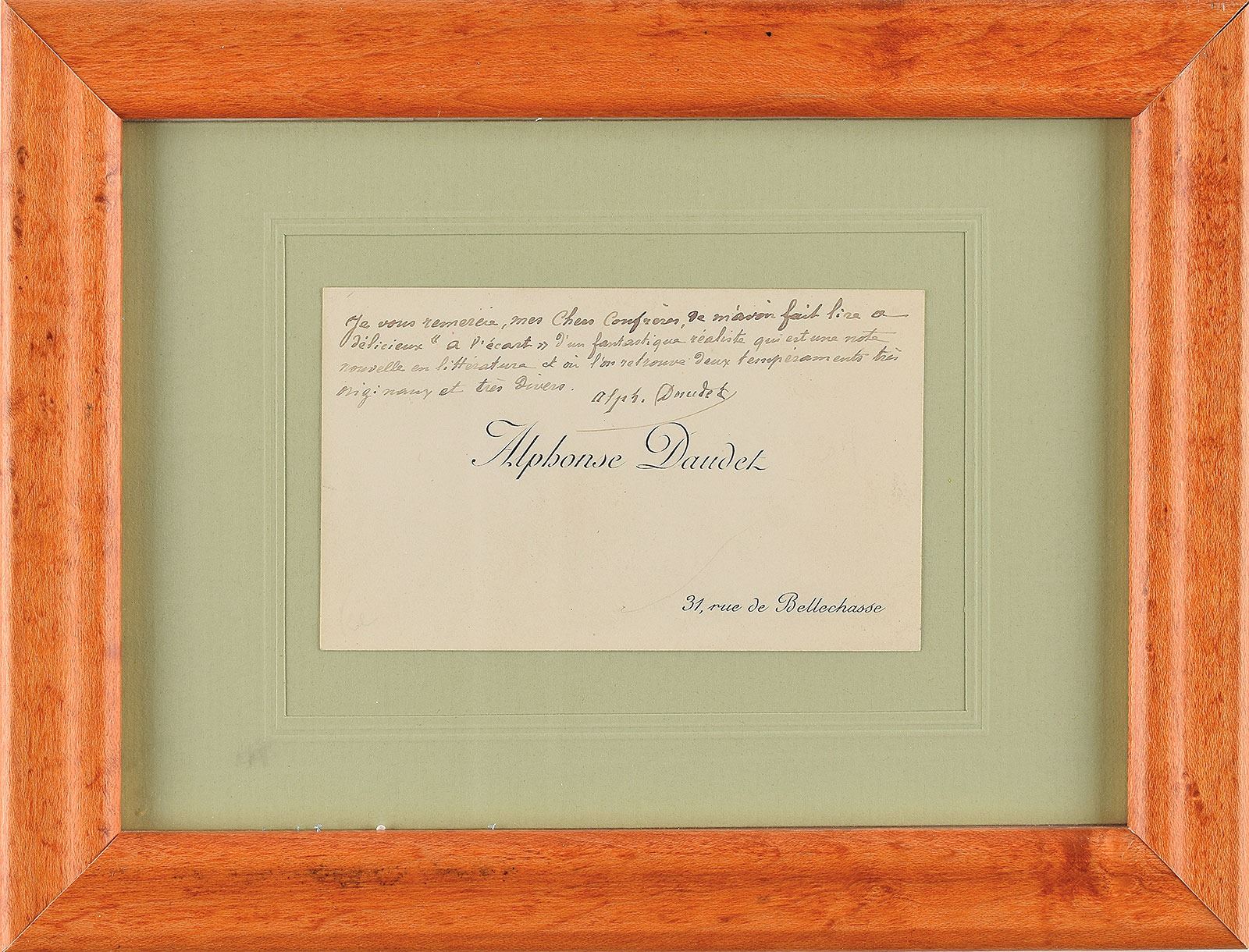 French novelist (1840–1897) known for his controversial political and social views. Untranslated ANS in French, signed “Alph. Daudet,” one page on a 4 x 2.25 personal calling card, no date. Mounted and framed to an overall size of 8.25 x 6.25. In fine condition.