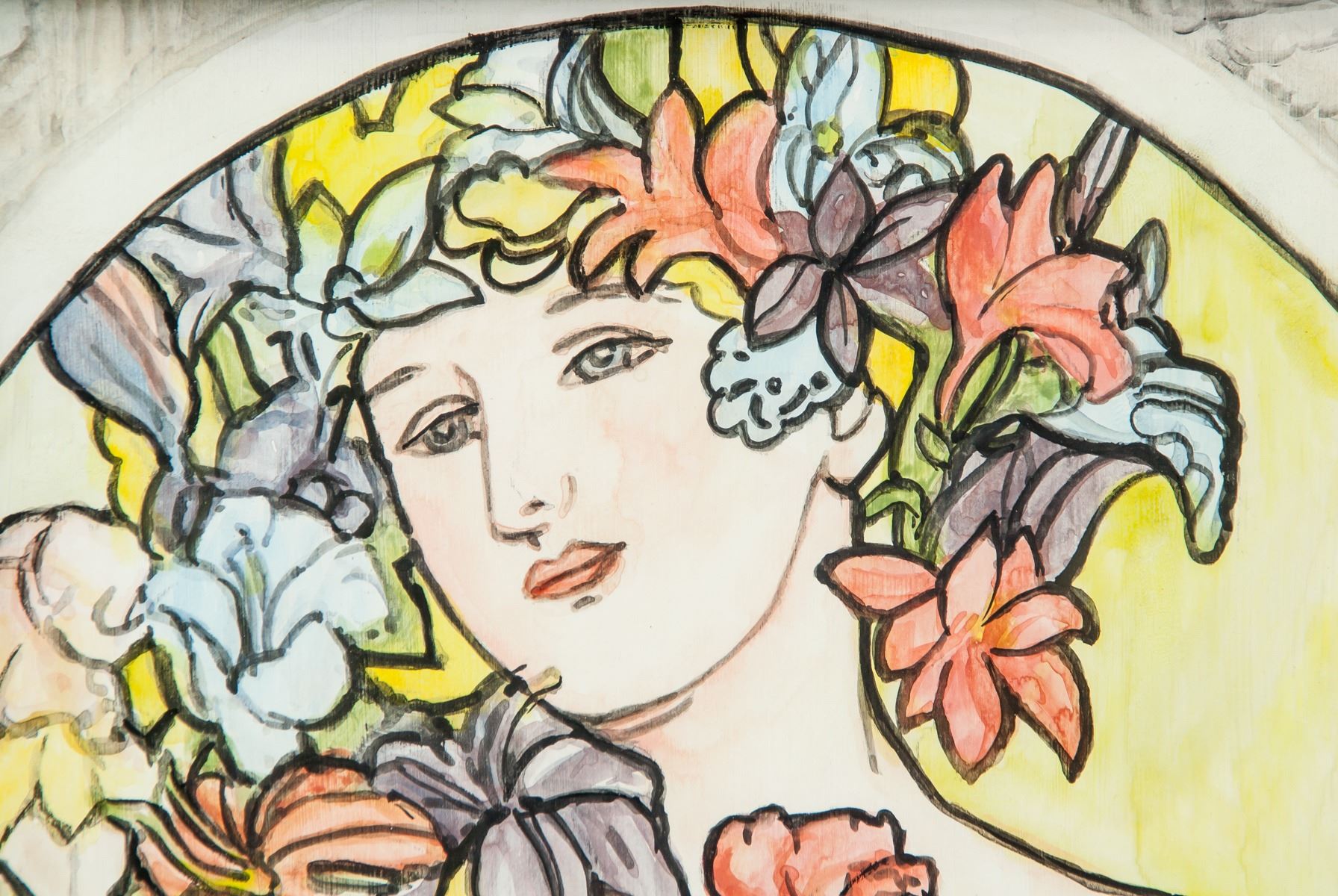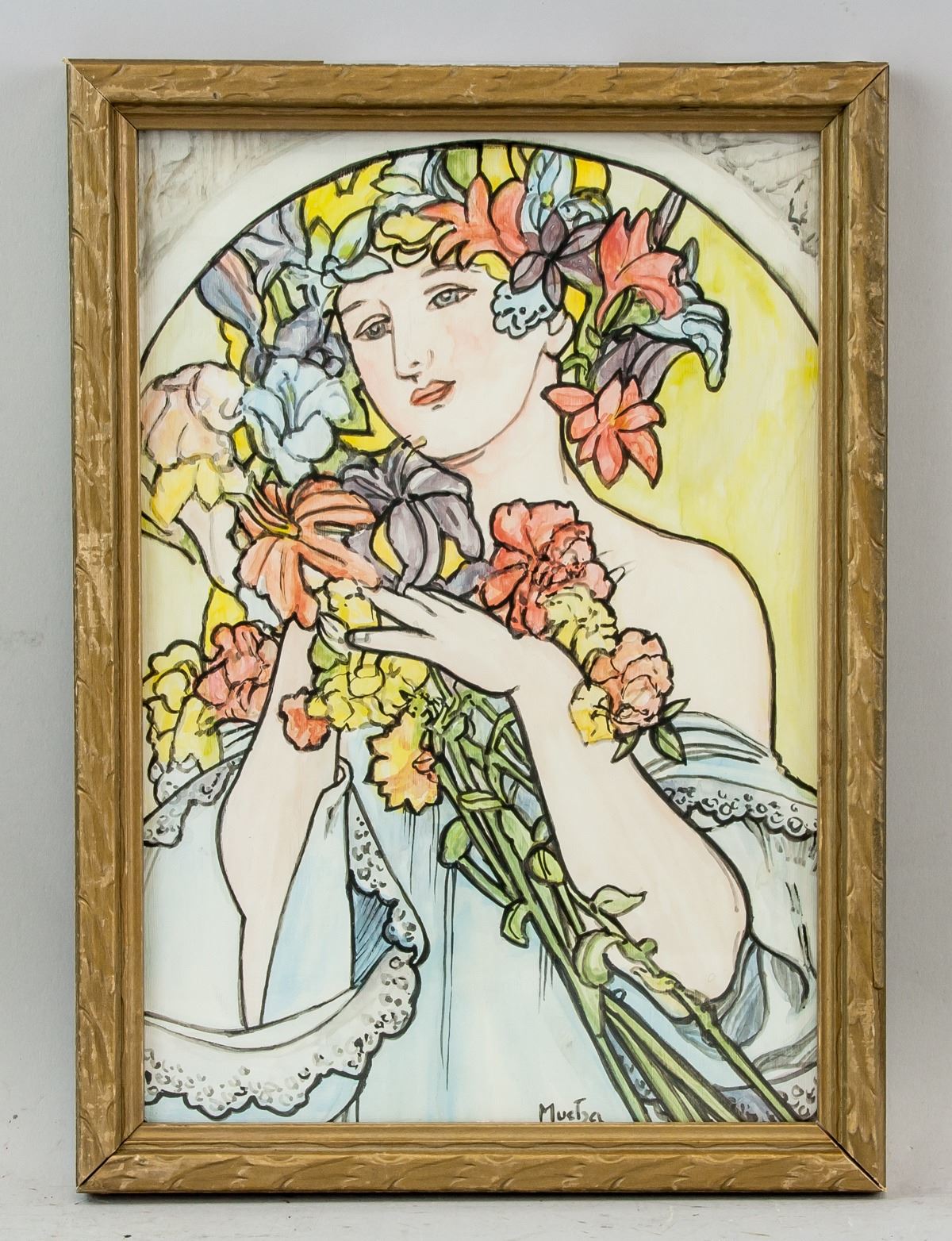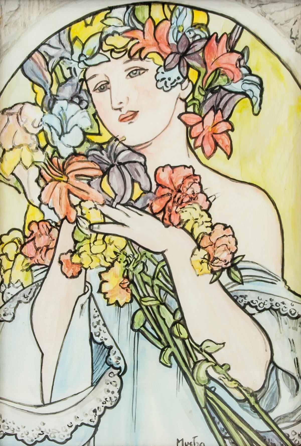 Mixed media on paper (gouache and ink), framed. Featuring a portrait of a woman. Signed Mucha on the lower margin. Attributed to Alphonse Mucha (1860-1939, Czech). 27.5 x 19 cm (10.8 x 7.5 inches). Frame size: 31.5 x 33 cm (12.4 x 13.0 inches). PROVENANCE: Southern Ontario estate