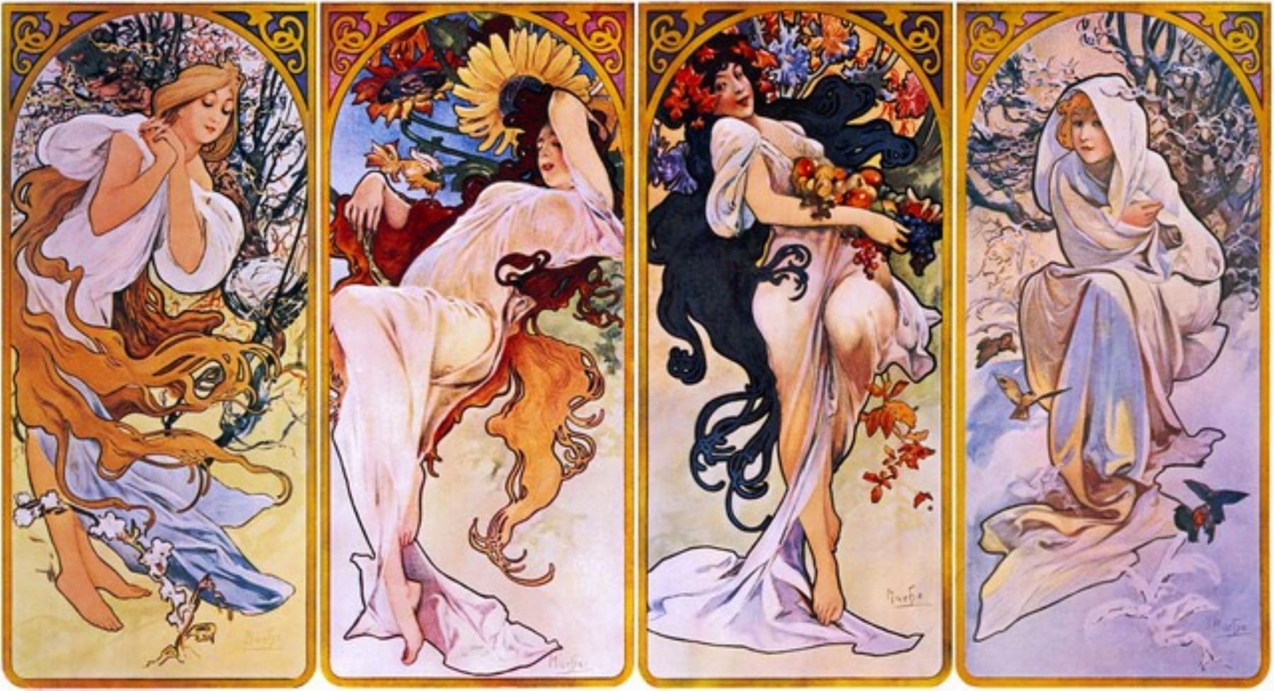 Artist: Alphonse Mucha  - Title: Four Seasons - Medium: Fine Art Giclee on Canvas - Image Size: Approximately 10.75 inches x 20 inches - Unframed on Unstretched Canvas - Biography: Alphonse Mucha 24 July 1860 - 14 July 1939), known as Alphonse Mucha, was a Czech Art Nouveau painter and decorative artist, known best for his distinct style. He produced many paintings, illustrations, advertisements, postcards, and designs.