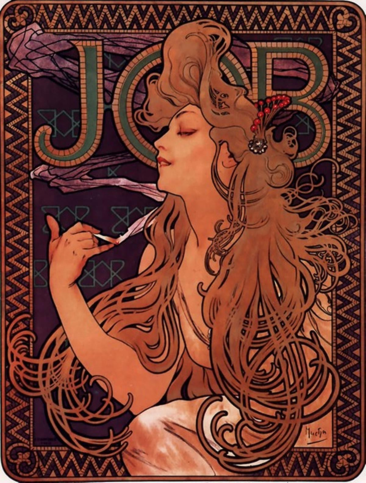 Artist: Alphonse Mucha - Title: Job - Medium: Fine Art Giclee on Canvas - Image Size: Approximately 20 inches x 15 inches - Unframed on Unstretched Canvas - Biography: Alphonse Mucha 24 July 1860 - 14 July 1939), known as Alphonse Mucha, was a Czech Art Nouveau painter and decorative artist, known best for his distinct style. He produced many paintings, illustrations, advertisements, postcards, and designs.