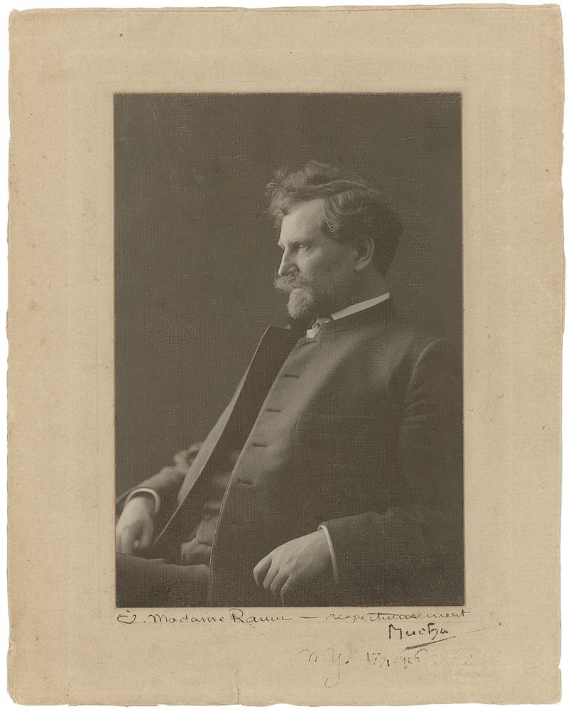 Influential Czech artist (1860–1939) best remembered for his stylized Art Nouveau depictions of beautiful women. Vintage 5 x 7.25 textured photo by J. F. Langhans of Prague, and affixed to its original 8 x 10 photographer’s mount, inscribed in fountain pen in another hand, in French, and signed “Mucha,” and dated “N.Y. 17/1 1906.” Some scattered light surface marks to photo, some scattered light toning and foxing to mount, small tear to bottom edge, and date light, but mostly legible, otherwise fine condition.