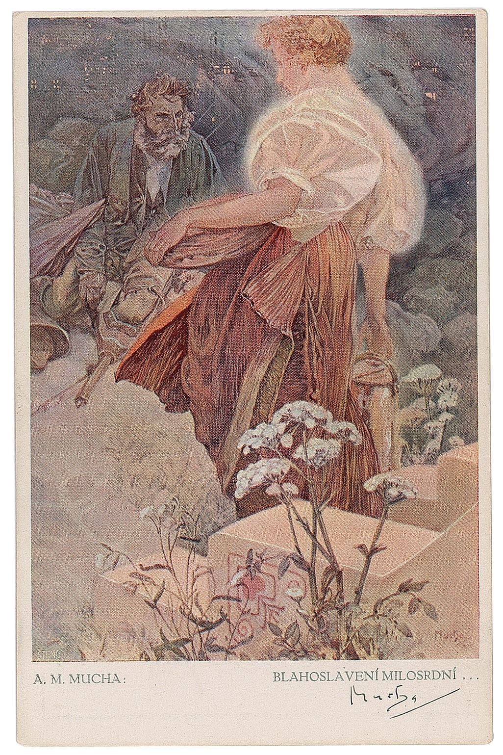Attractive color postcard, 3.5 x 5.5, featuring an image of Alphonse Mucha's 1906 work 'Blessed Are the Merciful: For They Shall Obtain Mercy,' signed in black ink, "Mucha." In fine condition.