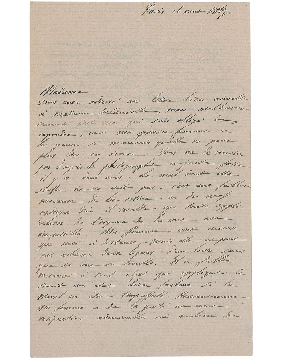 French-Swiss botanist (1806–1893) who developed the laws of botanical nomenclature. ALS in French, signed “Alph. de Candolle,” three pages on two adjoining sheets, 5.25 x 8.25, August 16, 1867. Untranslated letter to the wife of the botanist Rene Lenormand, mentioning "Lois de la Nomenclature." In fine condition.