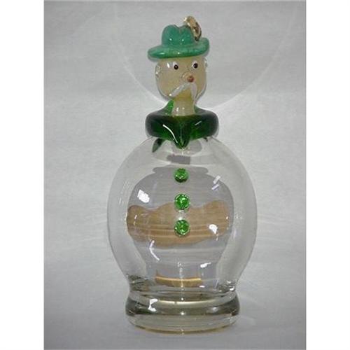 A decanter made in Czechoslovakia for Crème De Menthe Glaciale, 8 3/4" tall to top of stopper, 4" in diameter. The stopper is the head of a gentleman wearing an alpine hat with a feather in the brim, a thick green glass collar and green buttons suggest that the man is of some girth. The decanter is nicely executed and cute, the condition is very good, there are no chips although there is a scratch on the clear decanter just to the left of the bottom button, there is a tiny chip and internal fracture on the base of the stopper. The original label on the decanter reads: Bohemia glass, made in Czechoslovakia. (2+)