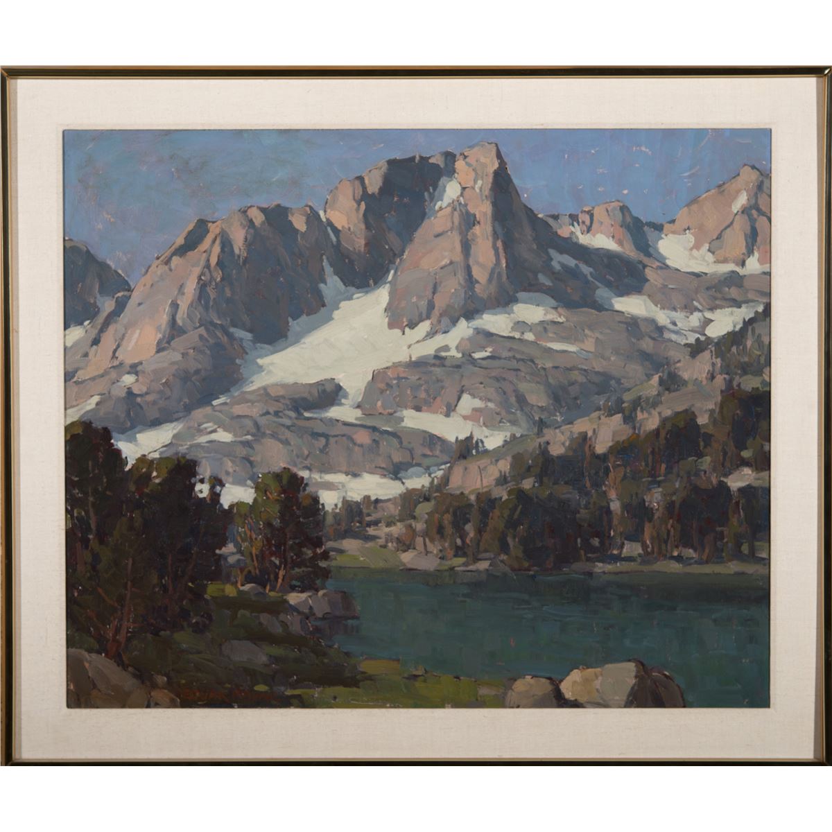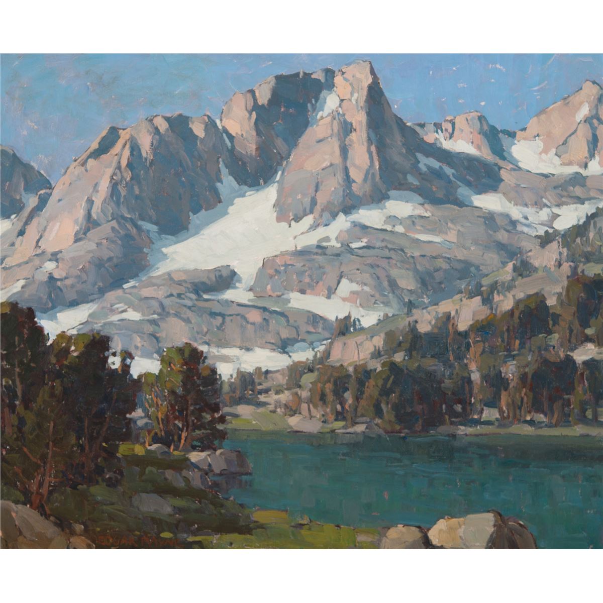 Edgar Payne’s loose realism, a style he developed early in his career, is well suited to painting the planar rocks and crags in works such as Alpine Lake. Brushstrokes that combine flat areas and edges of impasto replicate the smooths and roughs in the mountains, and the artist’s unerring sense of color and shade layers light over the contours of the scene. At 14, Edgar Payne knew that he wanted to be an artist. When his father disapproved, he left home, working his way to Chicago as a house, sign, and theatrical scene painter. He did receive some training in Chicago and he did enjoy some success there, but an enthralling visit to California’s Pacific coastline and the Sierra Nevada Mountains in 1909 set him on a course that would become a career. Three years later, Payne and his wife Elsie would settle in Laguna Beach and California landscapes would provide subjects for a lifetime of paintings.