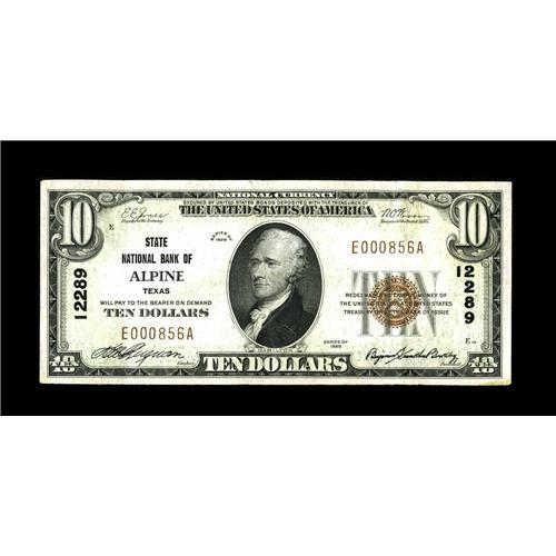 <B>Alpine, TX</B></I> - $10 1929 Ty. 1 <B>State NB</B></I> Ch. # 12289<BR>A scarce note from the only town to issue in this vast expanse of desert and mountains. Bright <B>Extremely Fine-About Uncirculated.</B></I><BR><BR><b>Shipping:</b> Coin/Currency (<a target="_blank" href="http://www.heritageauctions.com/common/shipping.php">view shipping information</a>)