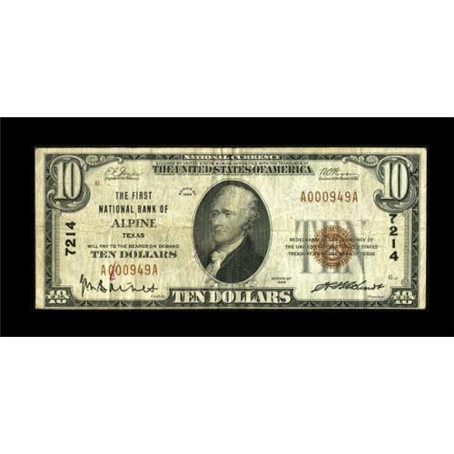 <B>Alpine, TX</B></I> - $10 1929 Ty. 1 <B>The First NB</B></I> Ch. # 7214<BR> A popular Texas note from a bank located in Brewster County. Officers are George W. Baines as cashier and H.L. Kokernot as president. <B>Fine-Very Fine</B></I> with a slight teller stamp in the left serial number.<BR><BR><b>Shipping:</b> Coins & Currency (<a target="_blank" href="http://www.heritageauctions.com/common/shipping.php">view shipping information</a>)